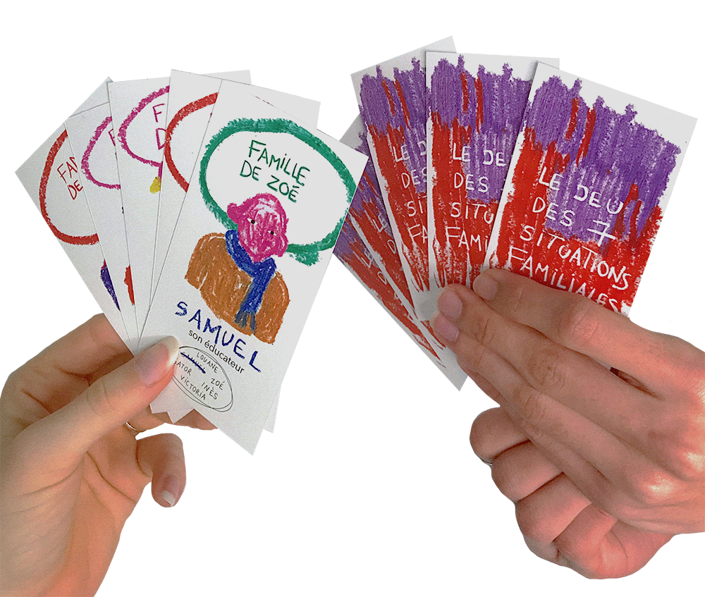 Le jeu des sept situations familiales se veut permettre aux enfants qui y joueront, de mieux se projeter en retrouvant leur propre rapport à leur « famille » ou bien, de s’ouvrir à d’autres perspectives qu’ils pourront rencontrer.