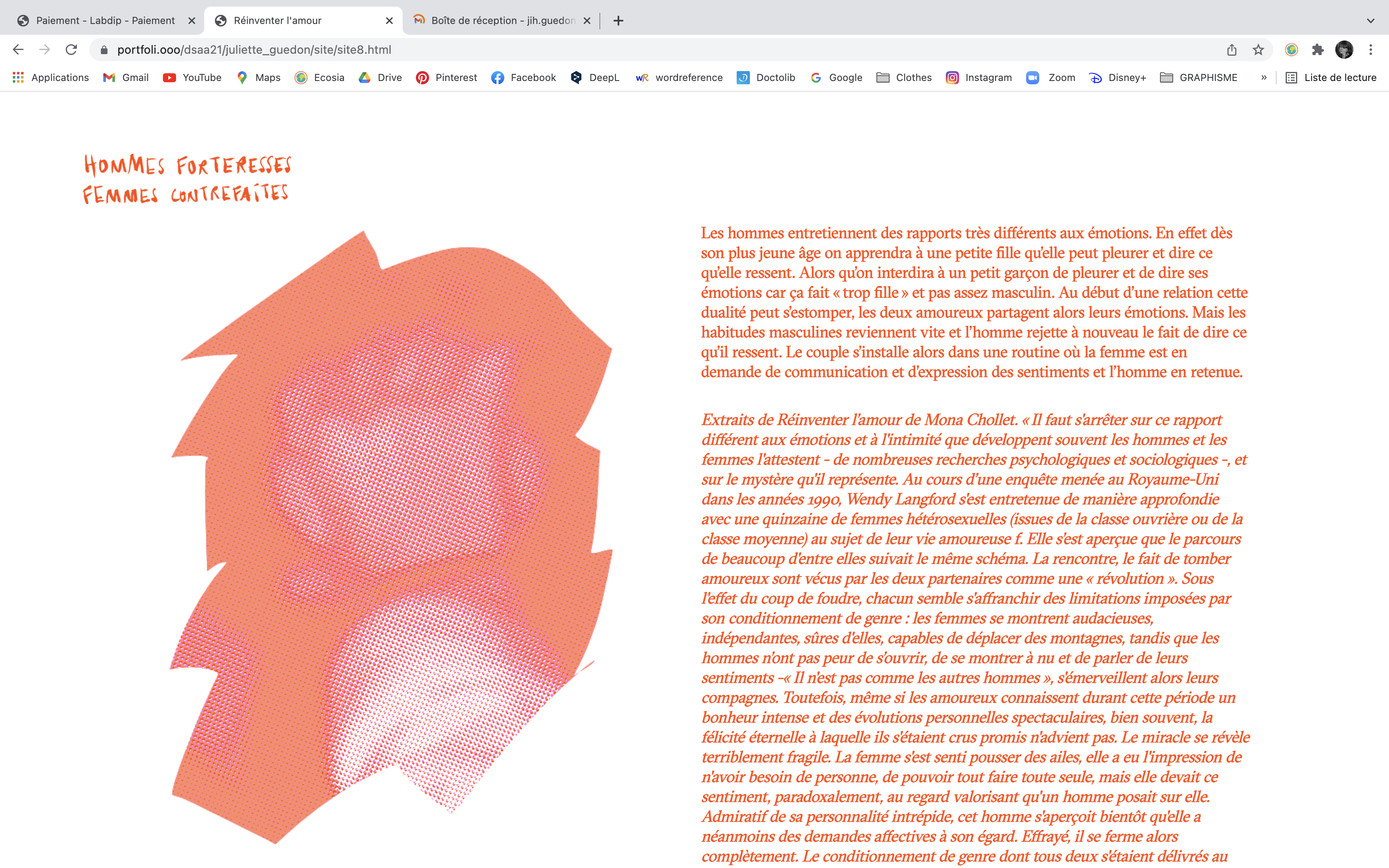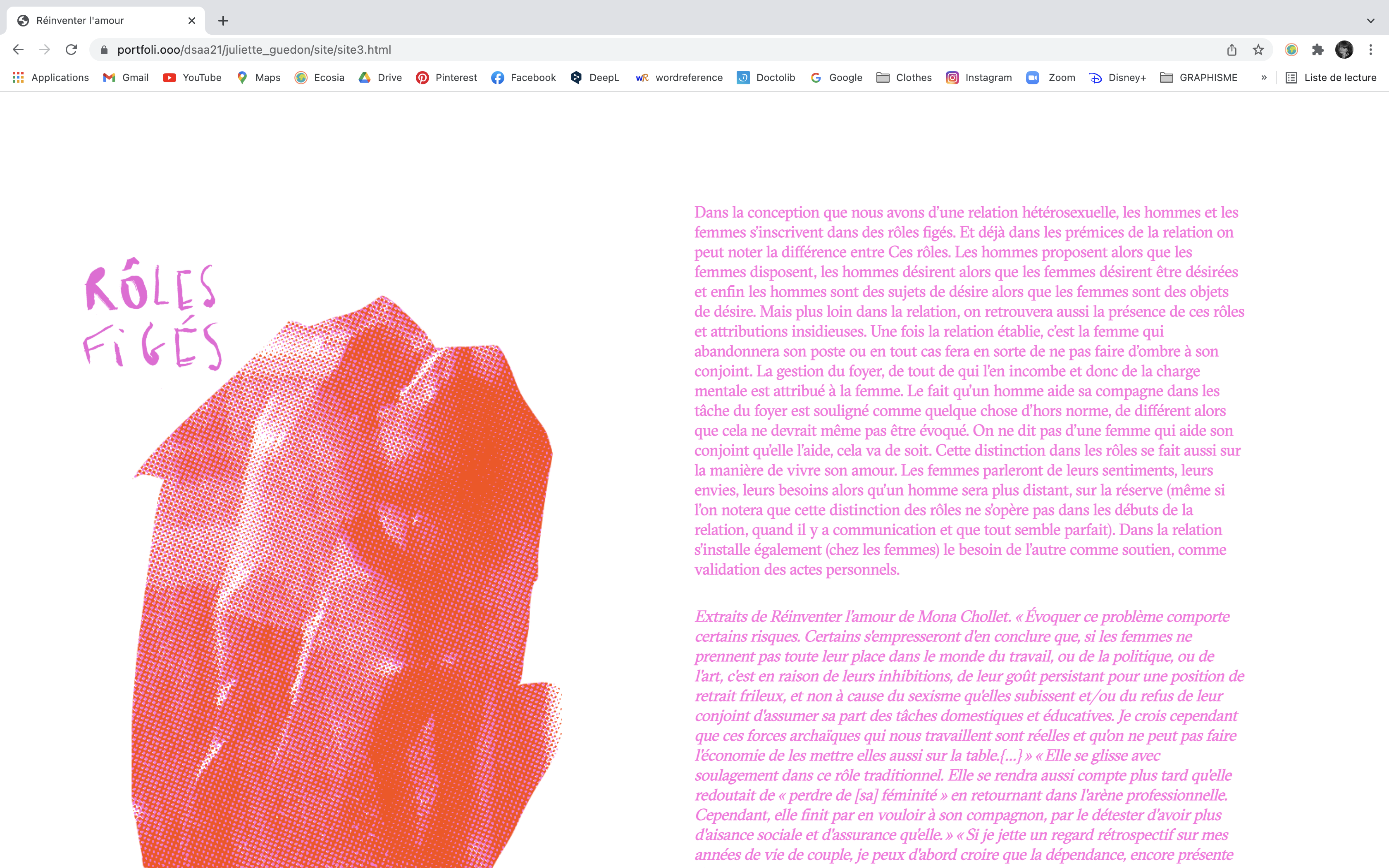 Création d'un site internet à partir du livre Réinventer l'amour de Mona Chollet et du podcast Le cœur sur la table. L'objectif était de réaliser 10 articles sur 10 thématiques présentes dans ces documents.
