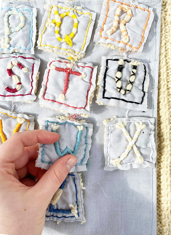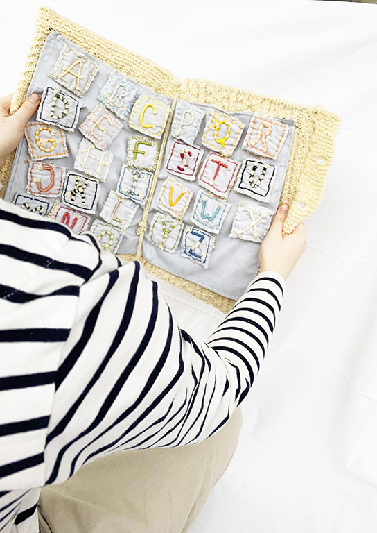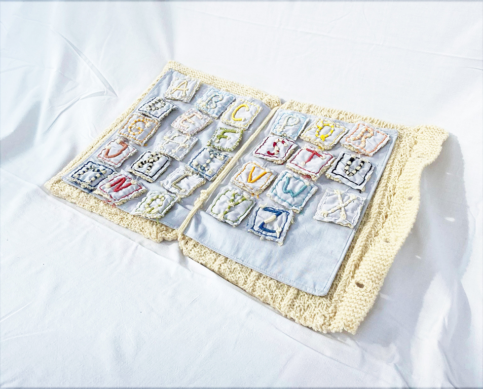 Avec une contrainte d’utiliser l’intégralité de la matière d’un vieux pull, j’ai décidé de décliner sa fonction sous un livre en tissu contenant un abécédaire en relief par l’usage de la broderie. Pour le créer, j’ai démaillé une partie du pull pour m’en servir comme fil conducteur de ma lettre, j’ai ensuite brodé autour de la laine avec la broderie pour créer sa forme finale. Ce projet m’a ainsi servi comme support d’exploitation à l’usage d’un jeu de manipulation pour l’expérience de l’atelier avec les jeunes enfants de l’institut des jeunes aveugles (cf projet