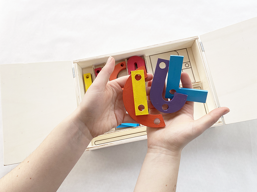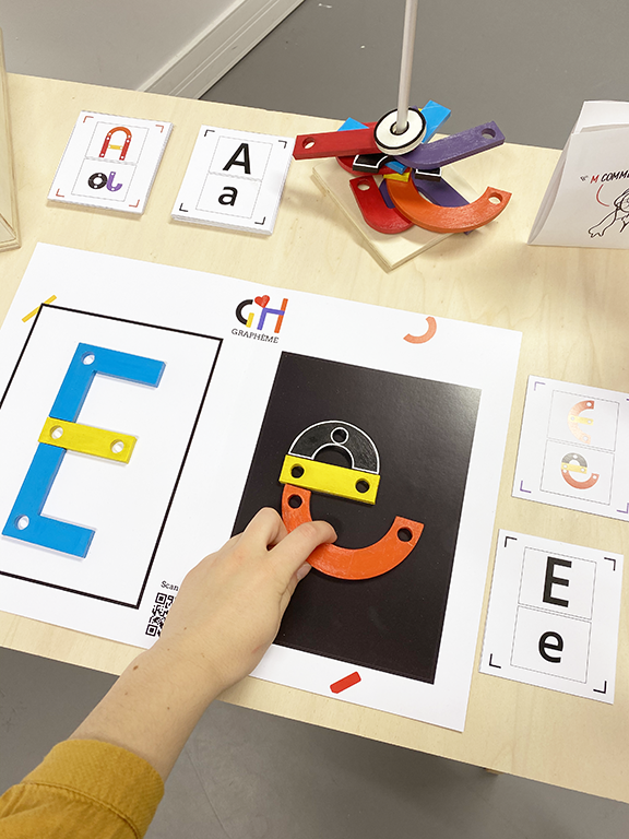 Après un travail théorique autour de l’apprentissage, la lecture et de la malvoyance, le projet graphème est né, il se présente sous forme d’outil de médiation pédagogique (une mallette) visant à exprimer sa créativité au cœur d’un processus d’apprentissage. Apprendre à l’enfant la constitution des différentes formes qui composent une lettre. Des formes en bois de couleurs permettent aux jeunes malvoyants de pouvoir recomposer les formes selon leur envie et créativité. Le kit est composé de plusieurs éléments : une notice, un tapis de jeu illustré, des formes en bois colorés, un totem de rangement et des cartes de références. En scannant le QRcode, l’enfant peut retrouver l’extension mobile qui lui permet de numériser son alphabet graphique.