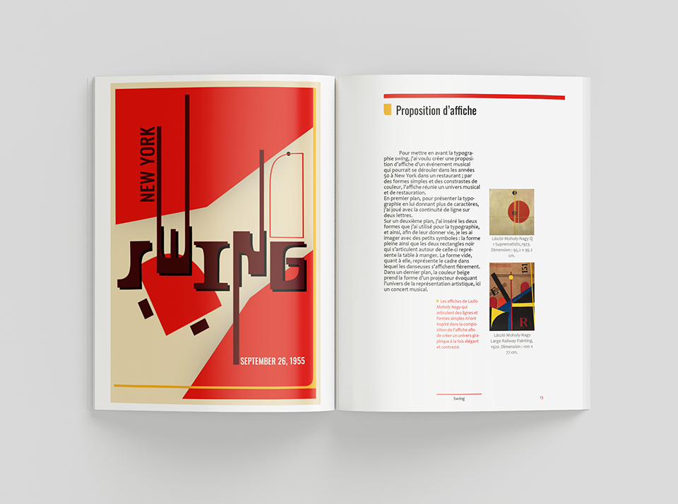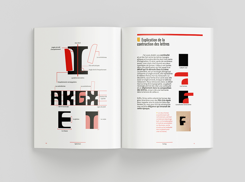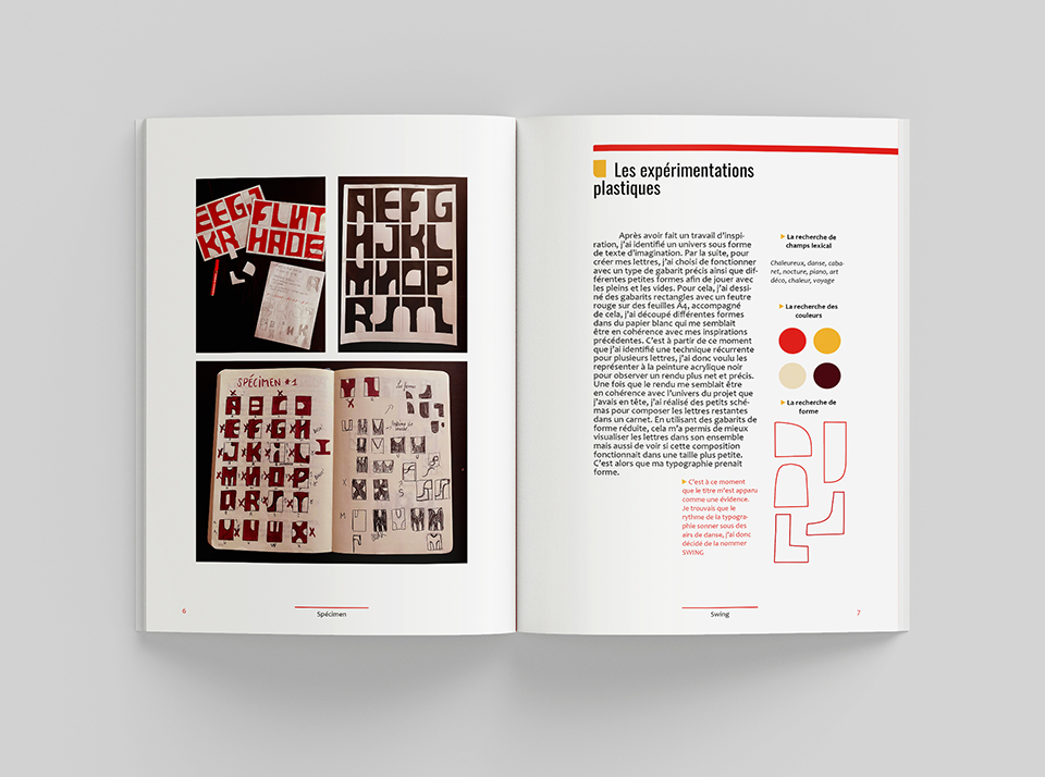 En partant d’un extrait musical, le choix de trois formes et un gabarit de référence, j’ai réalisé une identité graphique autour d’un caractère typographique se nommant « SWING ». Sous des allures d’un style rétro. Ainsi, afin de présenter cet univers, j’ai réalisé un spécimen typographique dans un protocole de mise en page sur le logiciel InDesign réalisé par mes soins.