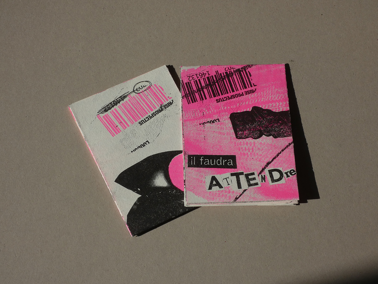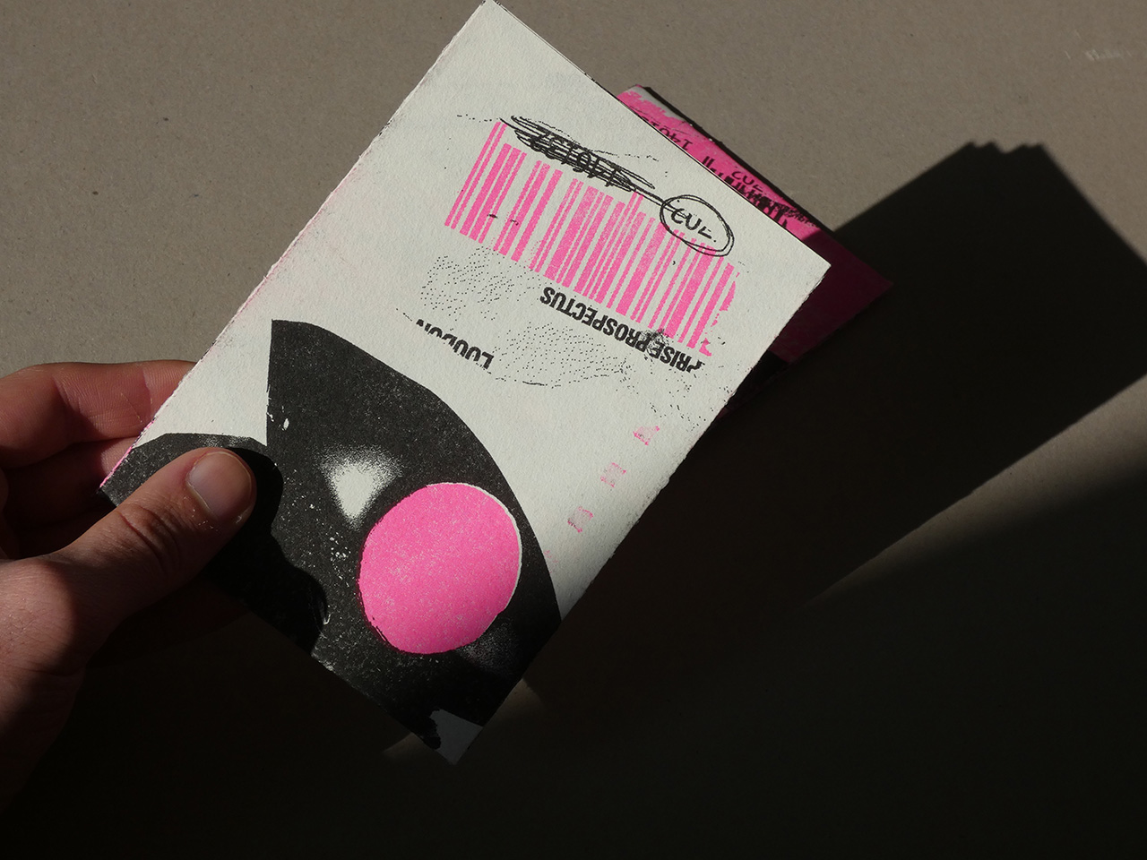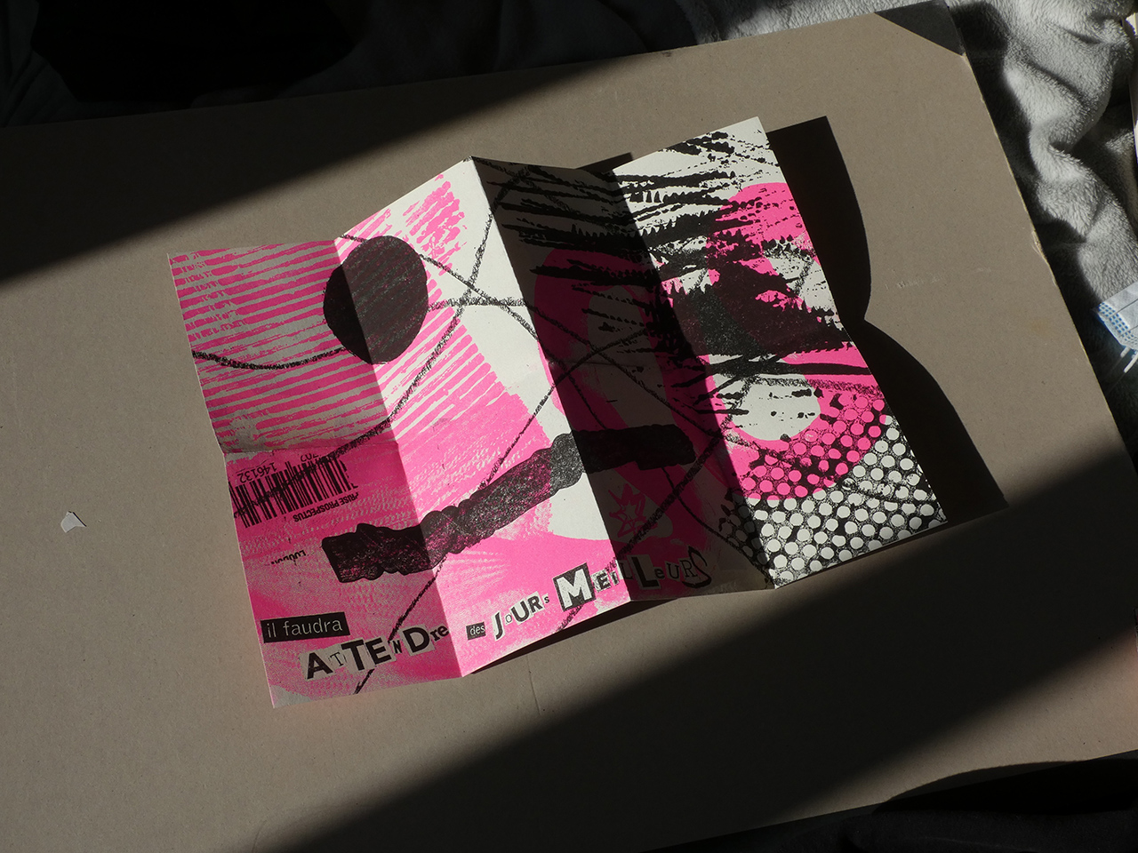 Dépliant/fanzine réalisé en collage et techniques expressives puis imprimé en risographie noir et rose fluo sur papier crème 130g.