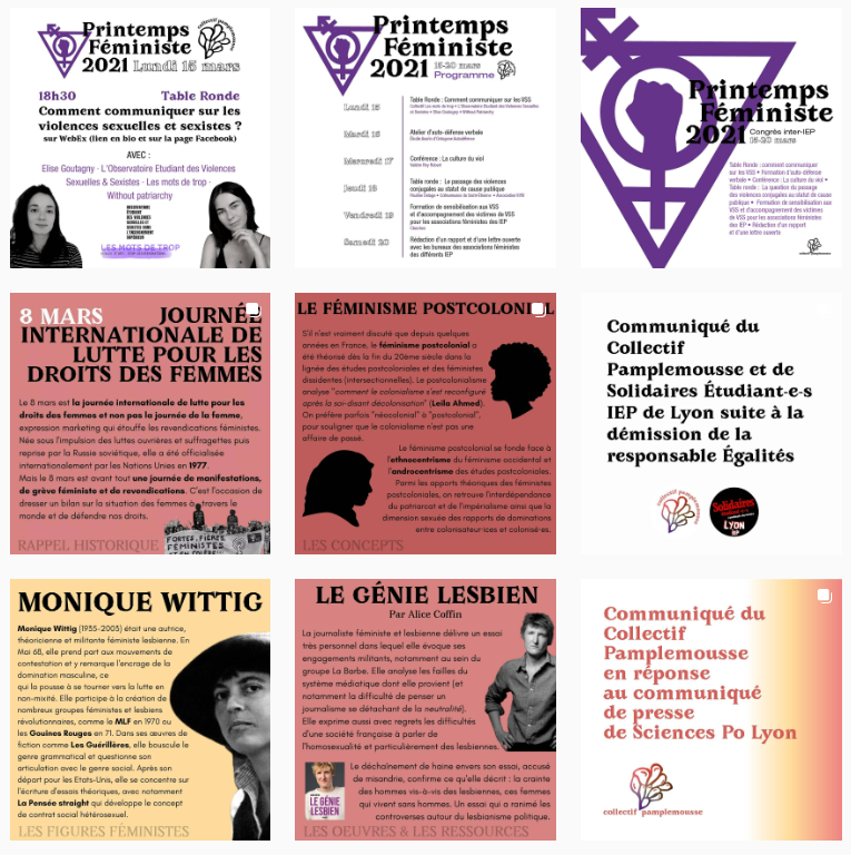 Rebranding of the visual identity for the "Collectif Pamplemousse", an intersectionnal feminist association of the Political Science Studies Institute of Lyon. The logo was completly redesign to be less evocative of a vulva. Designs of instagram layout templates that could be easily reproduced and reused on Canva by any-member of the group. (Canva is a free online software