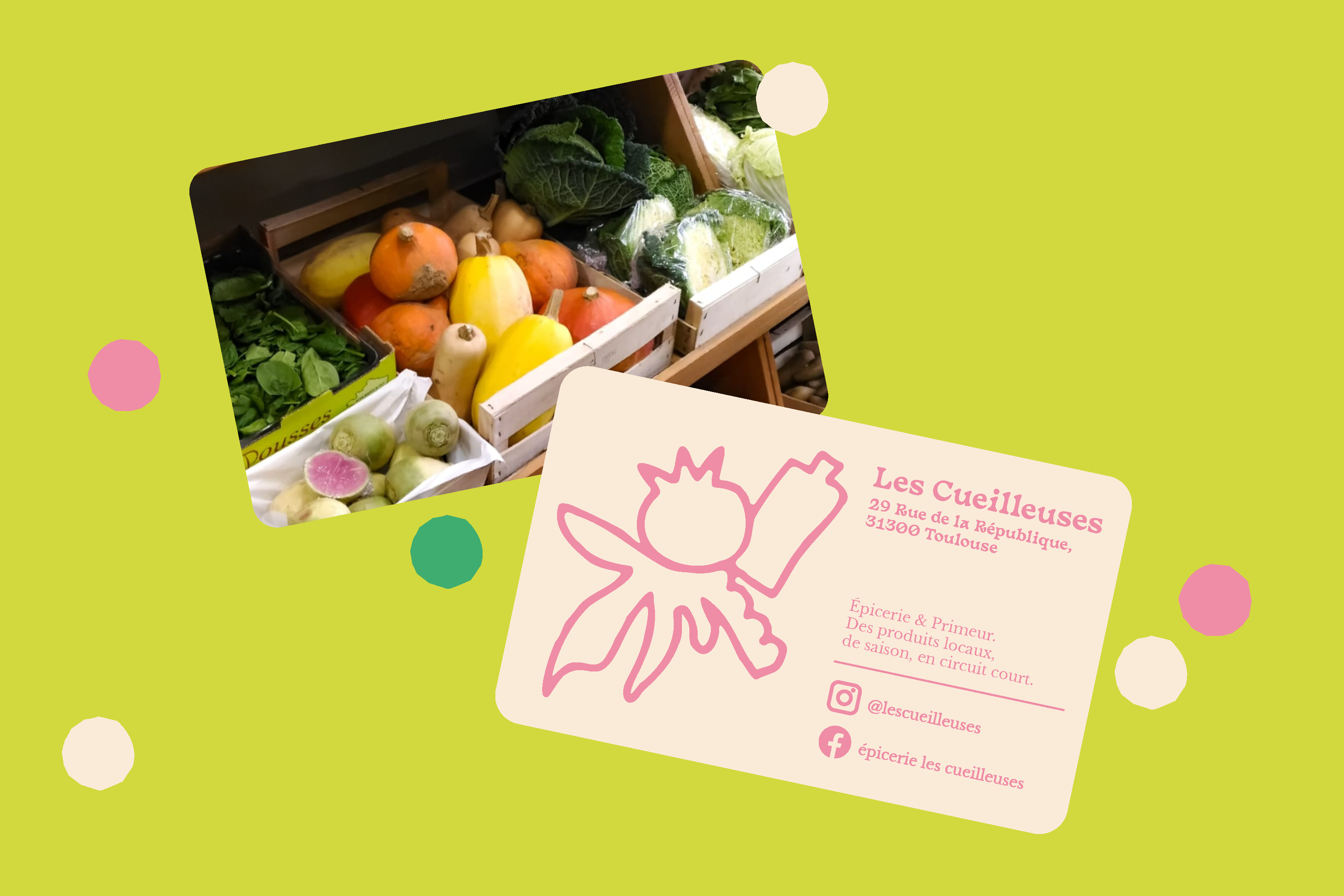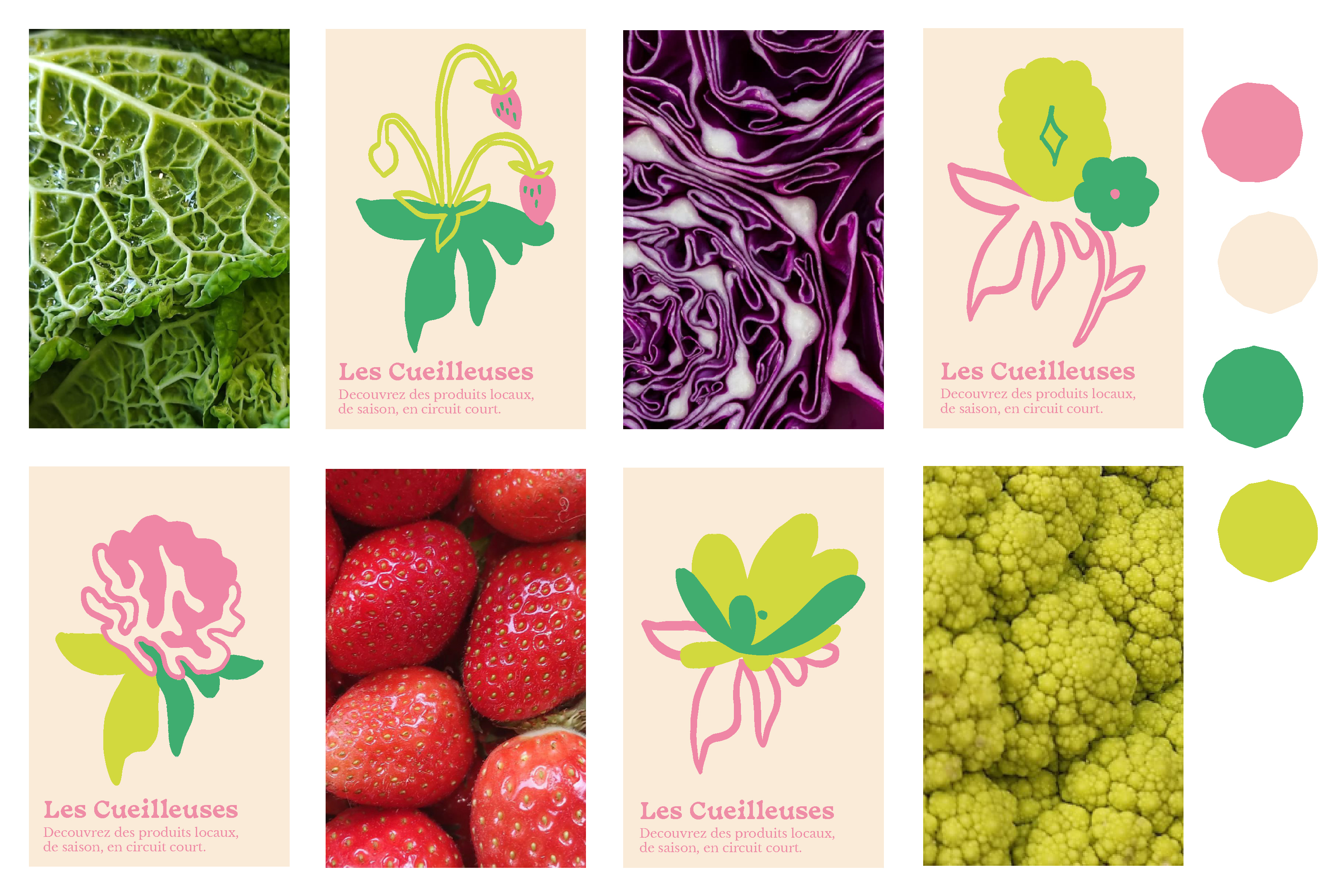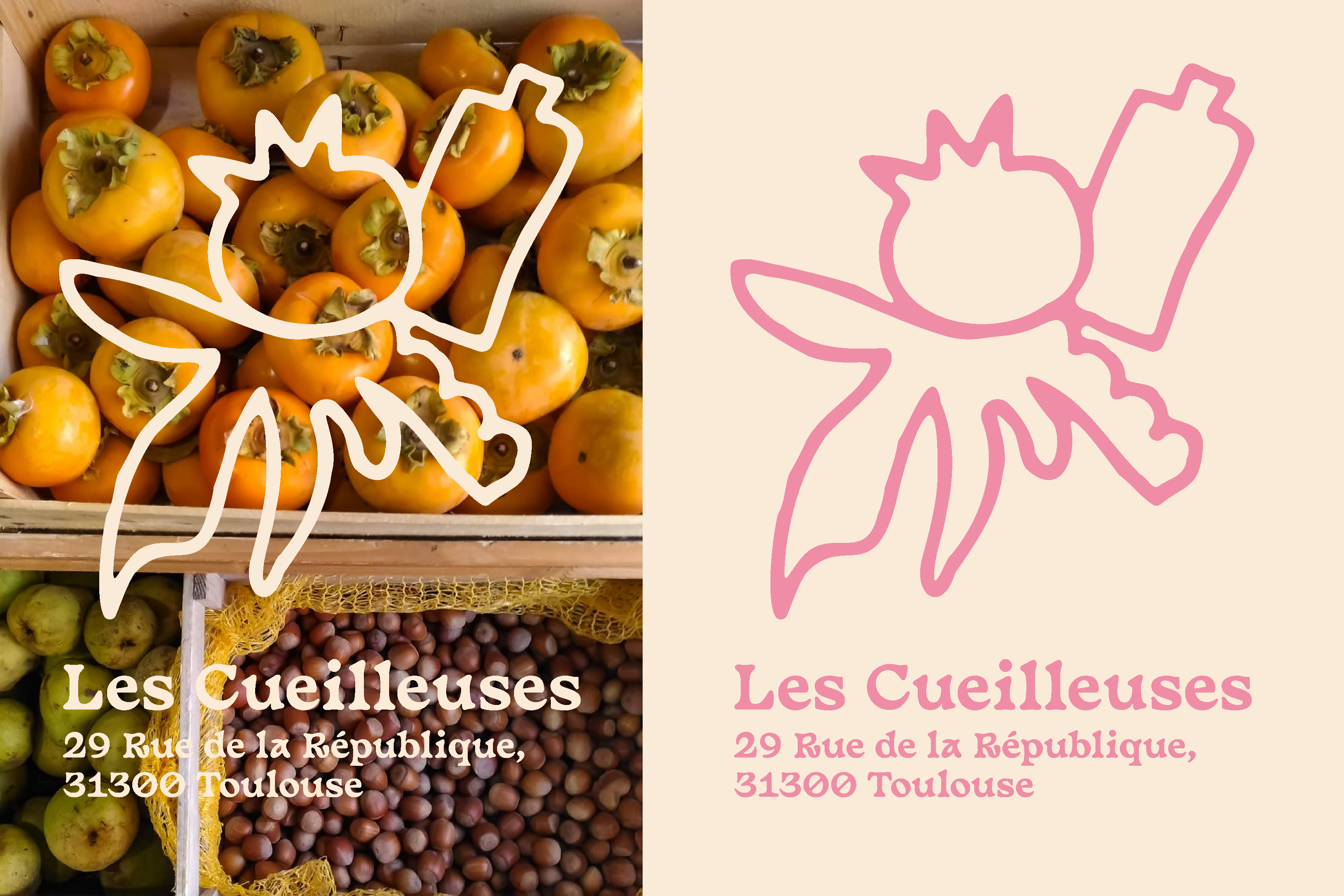 Réalisation d'une identité visuelle pour les cueilleuses, qui valorisent leurs valeurs. Les cueilleuses est une épicerie BIO et locale Toulousaine, qui s'engage à proposer les meilleurs produits à leurs clients. Identités aux couleurs rafraichissantes, inspirées des Pantones des produits locaux. Logotype fixe,aux courbes flexibles rappelant un savoir-faire manuel et aux formes déclinables.