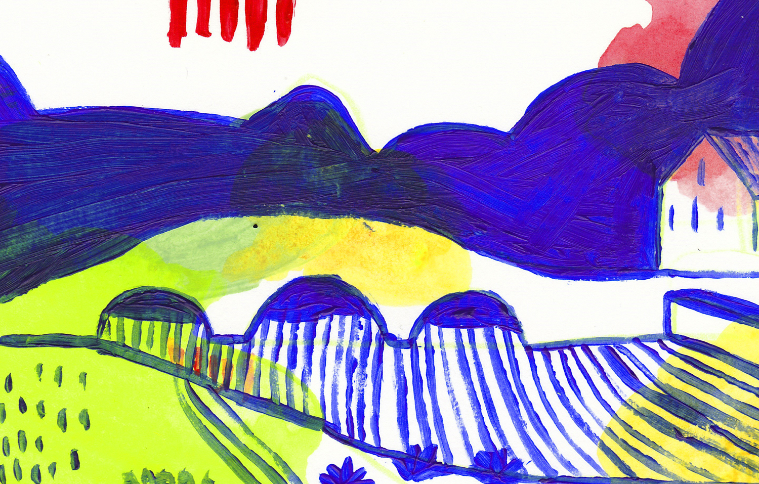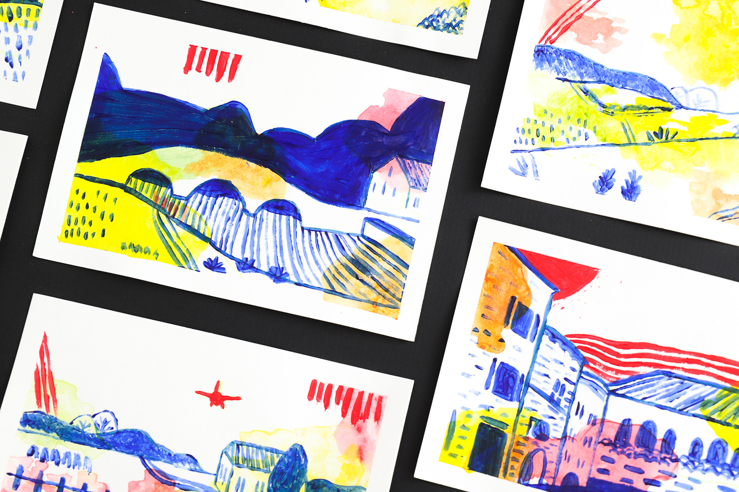 Représentation de mon village d’enfance selon mes souvenirs sur des cartes postales, en jouant sur la double lecture des images. L’aspect physique comme, avec les balades en forêt, les vieux ponts ou encore les potagers. Les couleurs représentent les sensations non définies liées à ses lieux.