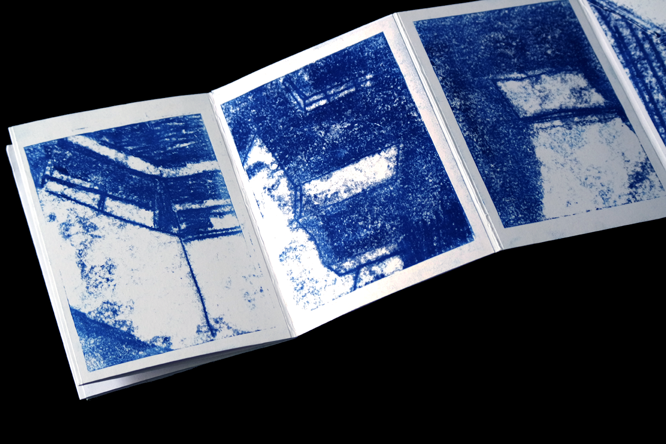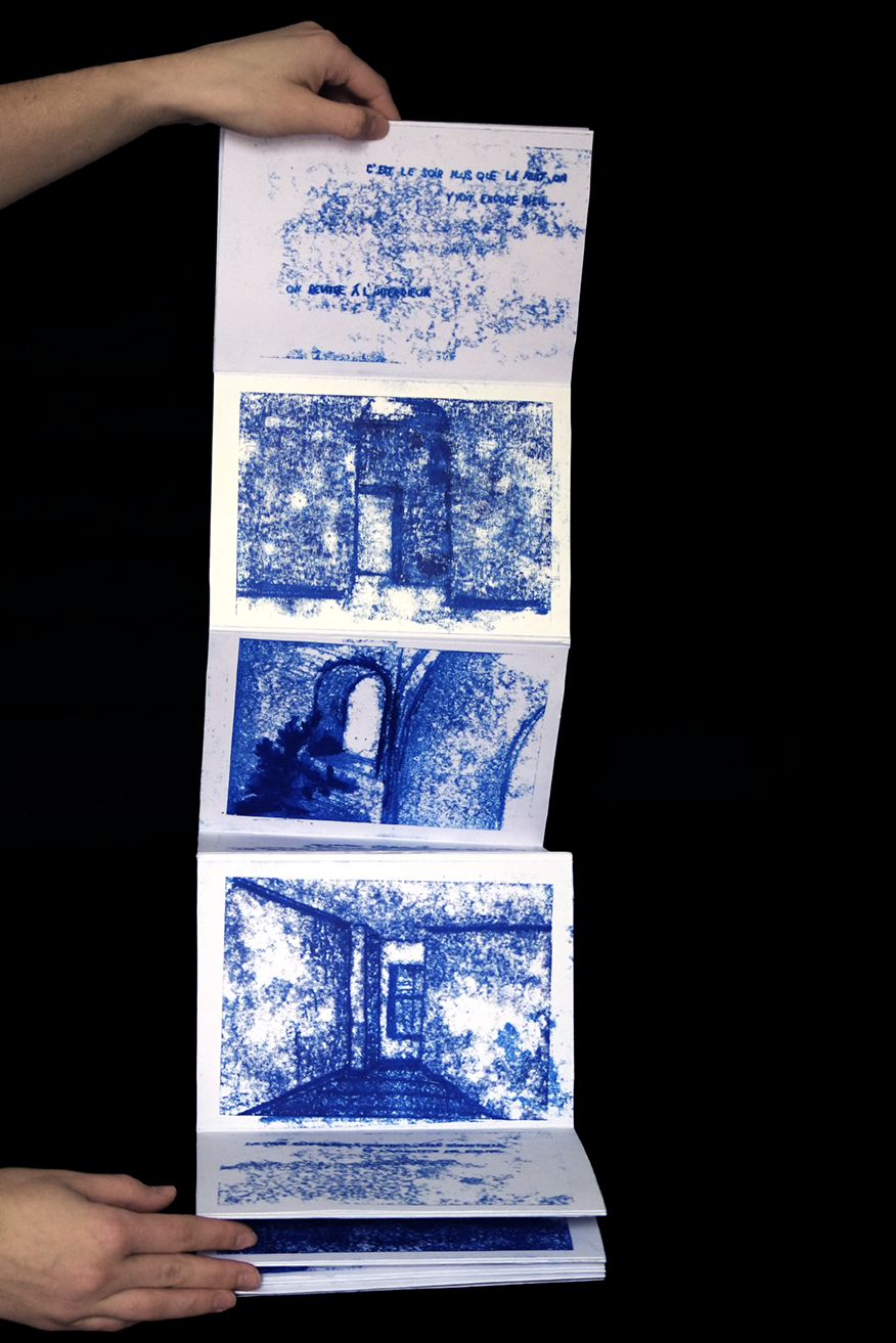 Réalisation d’un leporello illustrant une de mes aventures. On y découvre un lieu désert, fantomatique qui s’efface et devient abstrait à l’arrivée de la nuit et de mon angoisse qui grandit. * Création of a leporello illustrating one of my adventures. We discover an uninhabited place, ghost-like that fades away and which becomes abstract as the night comes and my torment grows.