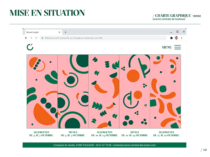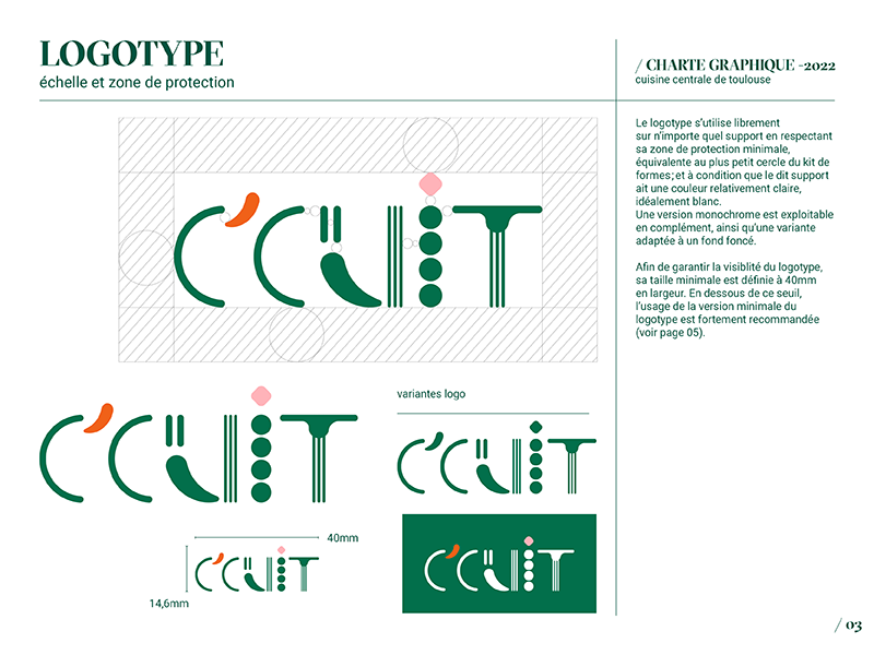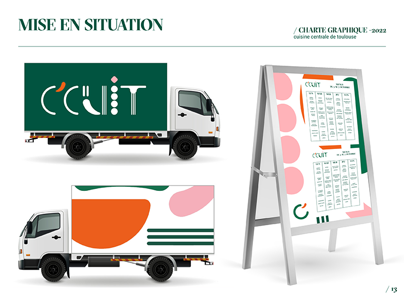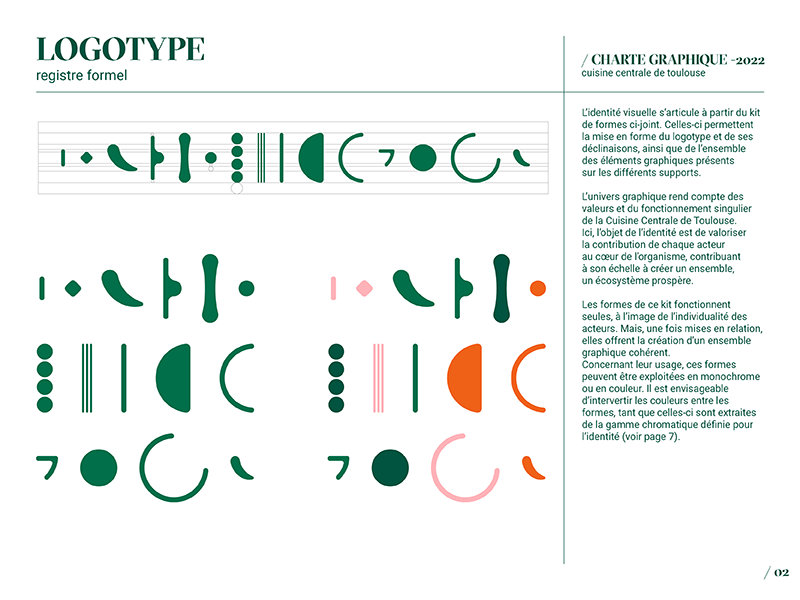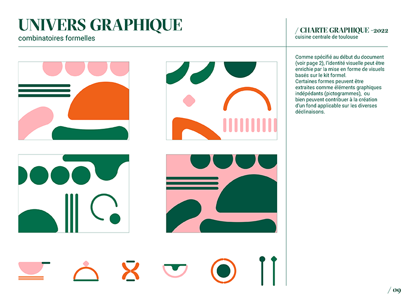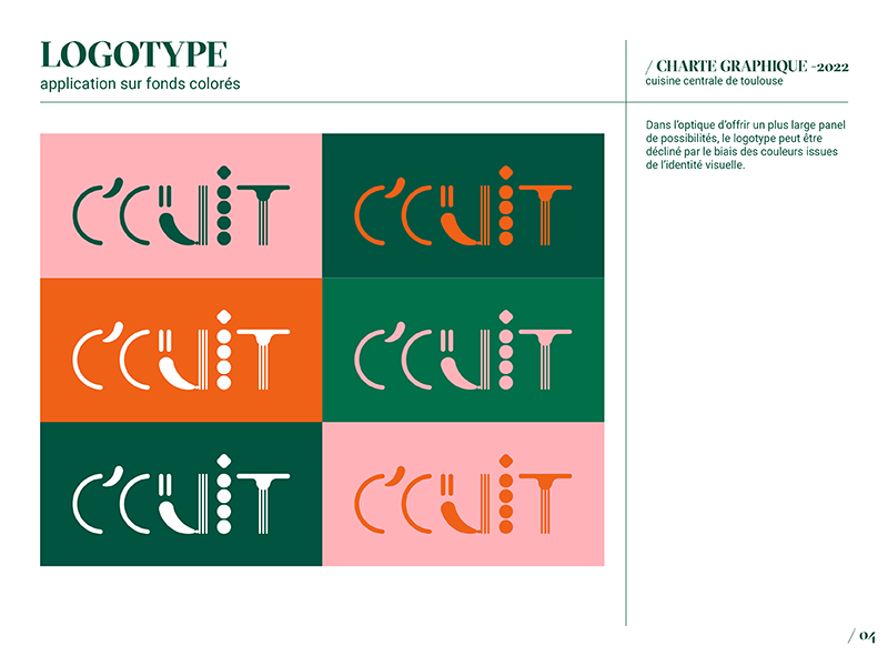 La recette est le nom donné au projet de création d'une identité visuelle pour la Cuisine Centrale de Toulouse. Cet organisme est en charge de la confection et la distribution des repas pour l'ensemble des cantines scolaires de Toulouse. L'identité s'articule à partir d'un kit formel, qui permet une mise en forme à la fois typographique et graphique. Par le biais du principe d'assemblage, de combinatoire, l'identité fait écho au fonctionnement singulier de la Cuisine Centrale, et valorise alors un «écosystème» graphique déclinable de multiples manières.