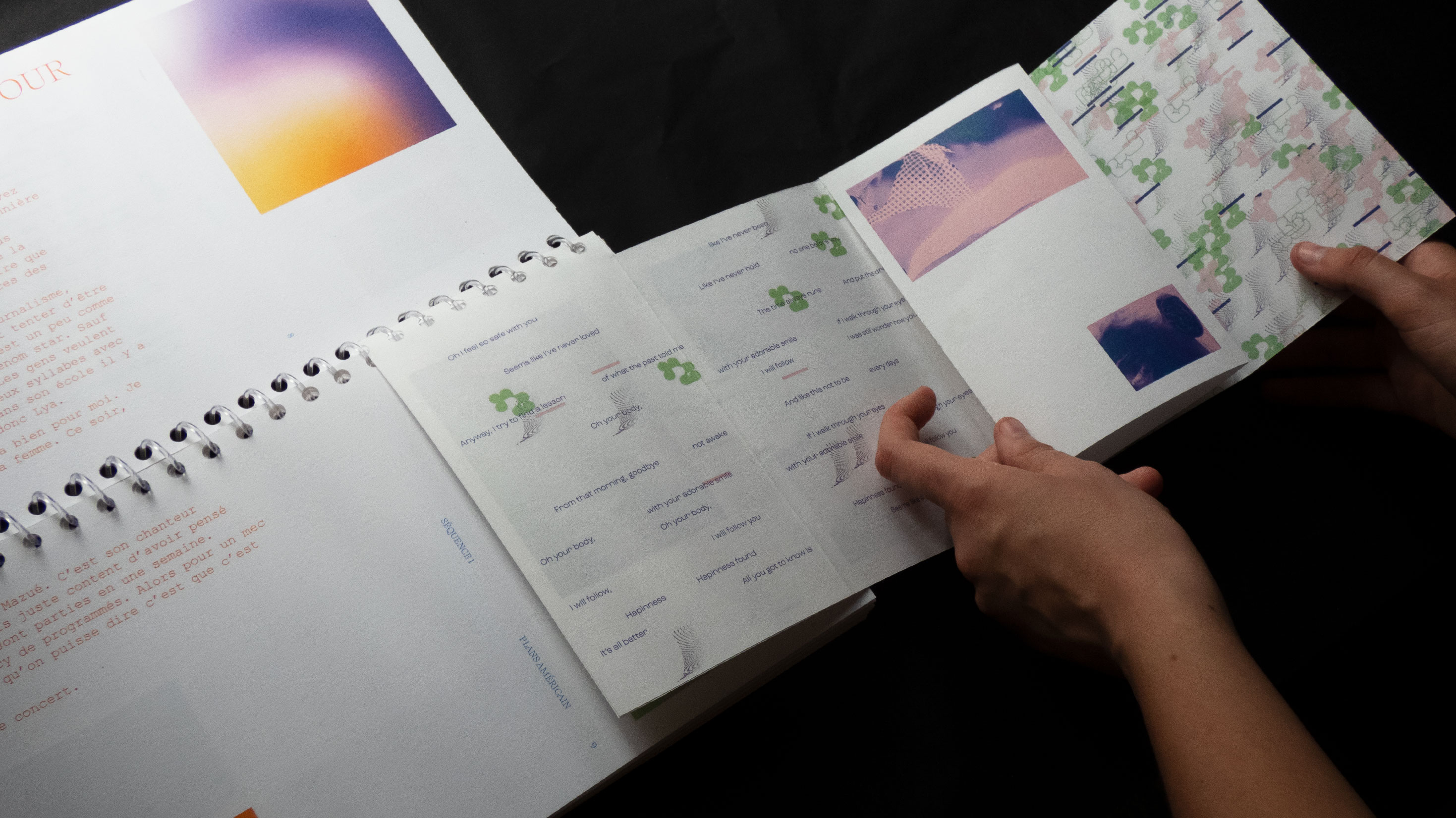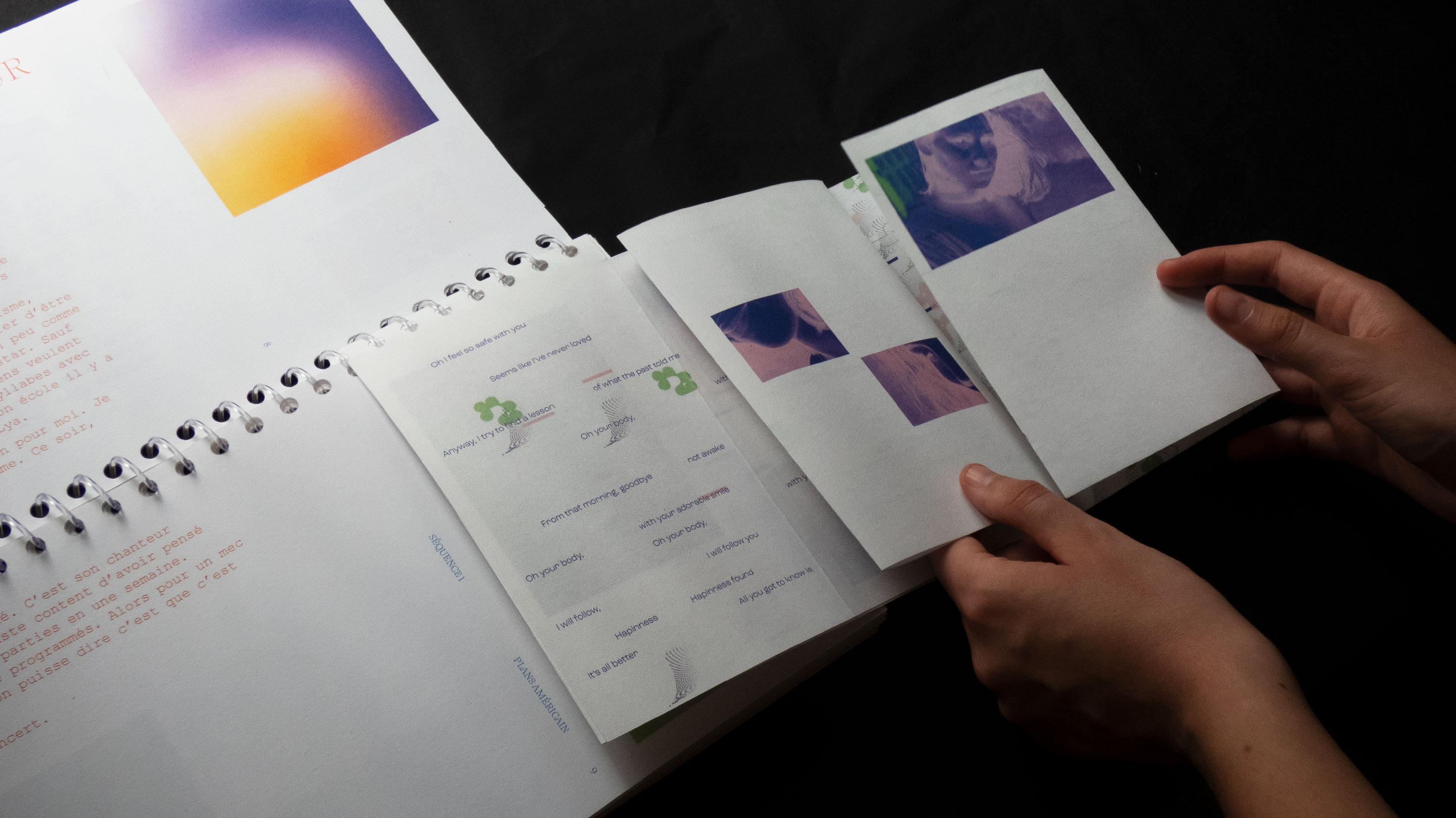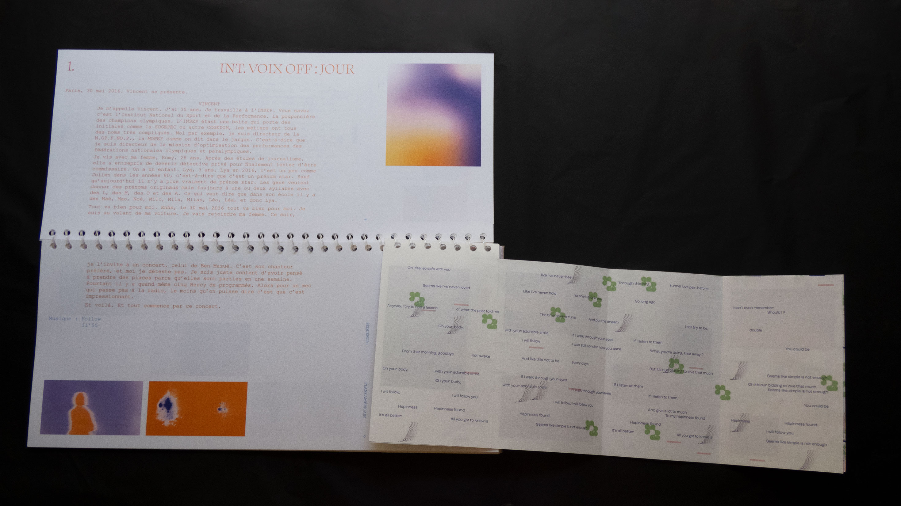 Ce projet auto-initié propose un objet éditorial non-standard qui incarne le récit cinématographique et musical du concert-audio de l’auteur-compositeur-interprète Ben Mazué. C’est une sorte de produit dérivé où j’interprète le film imaginé, raconté et chanté par ce dernier. Cette appropriation personnelle se traduit au travers de mes choix techniques et esthétiques éditoriaux faisant sens avec le fond.
