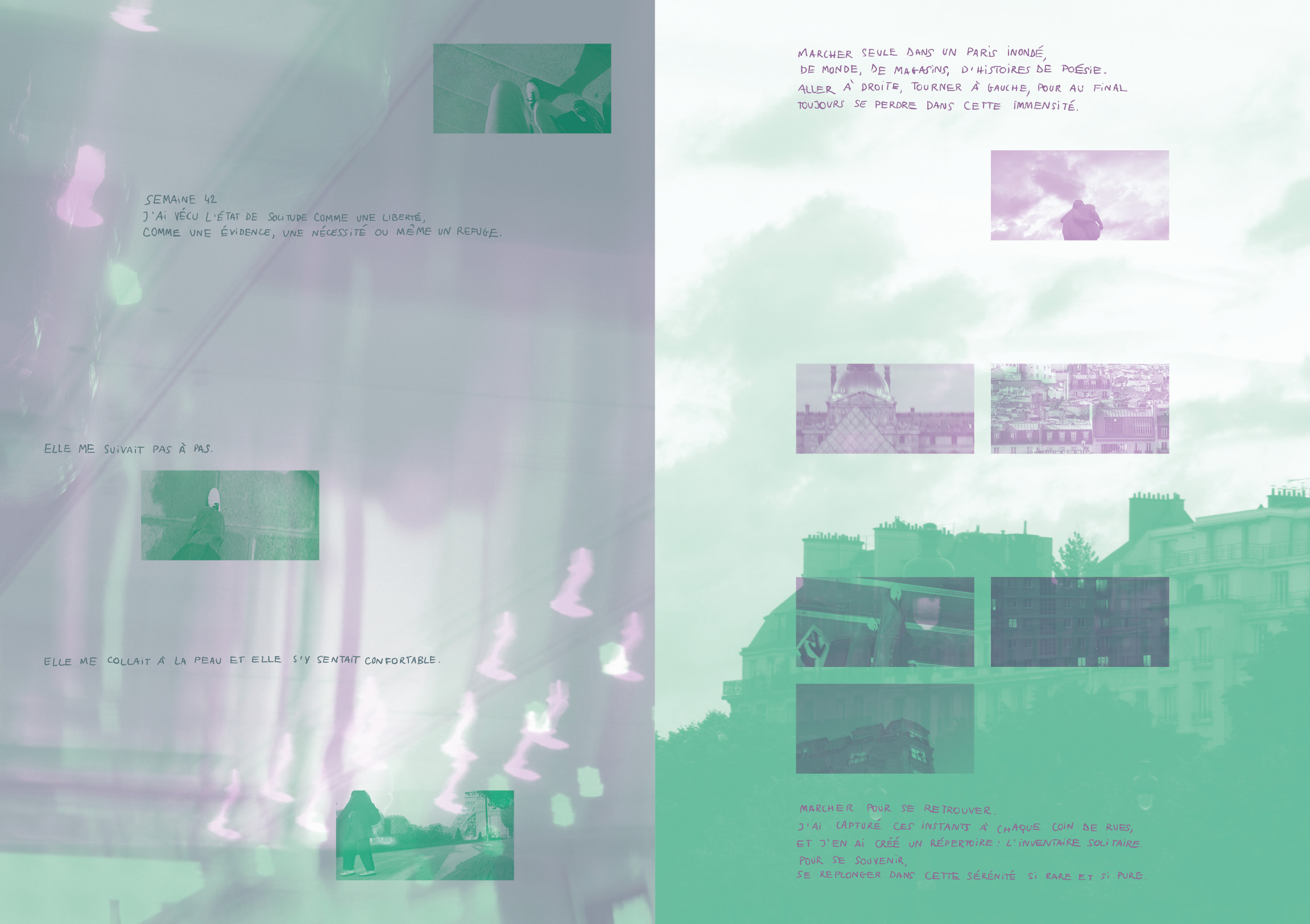Cette composition typo-photo met en image un séjour solitaire* à Paris. L’appropriation de ce mot s’exprime à travers la volonté de le rapprocher à un lieu, aux musiques ancrées, aux sensations vécues pendant un séjour parisien. Ce sentiment nostalgique est représenté par un texte dialoguant avec une collecte photographique créant ainsi l’inventaire solitaire.