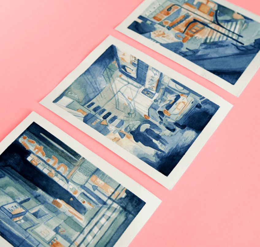 Après avoir réalisé les fameuses encres végétales, j'ai réalisé un triptyque en ayant choisi pour modèles des photographies aux couleurs assez similaires : bleu nuit avec des touches de rouges chauds et de jaunes, pour garder une harmonie colorée et un dialogue entre les trois illustrations. J'ai marqué des zones de contrastes lumineux et sombres qui se répondent pour avoir un équilibre entre les lumières de la ville éclairée et la noirceur de la nuit dans les coins des ruelles.