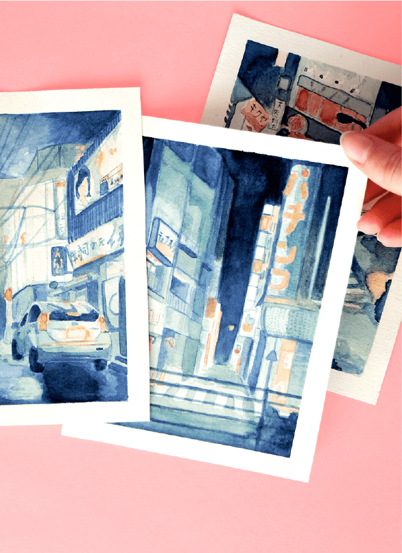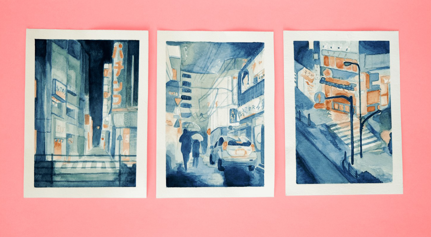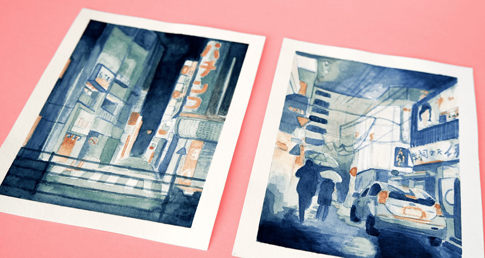 Production d'illustrations sur le thème de Tokyo la nuit, à partir d'encres végétales faites maison. Il était question de mettre en pratique la synthèse soustractive, pour tenter de produire du noir et du contraste en superposant ou mélangeant les encres.