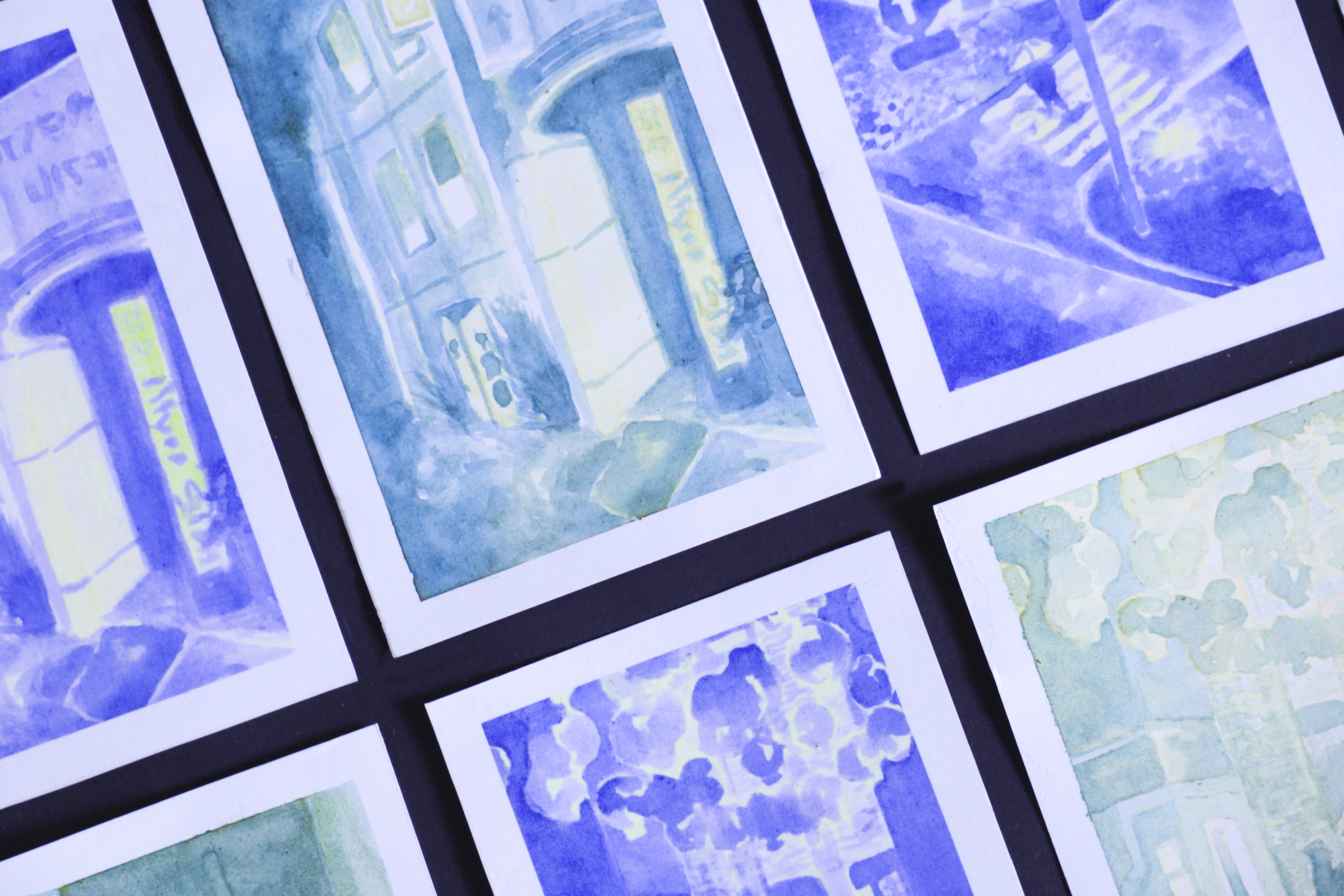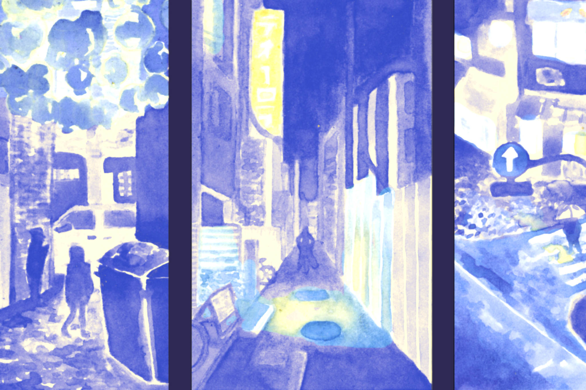 Peinture la ville de Tokyo de nuit à partir d’encres végétales faites à la main. Bichromie de la nuit et travail sur le principe de la synthèse soustractive.