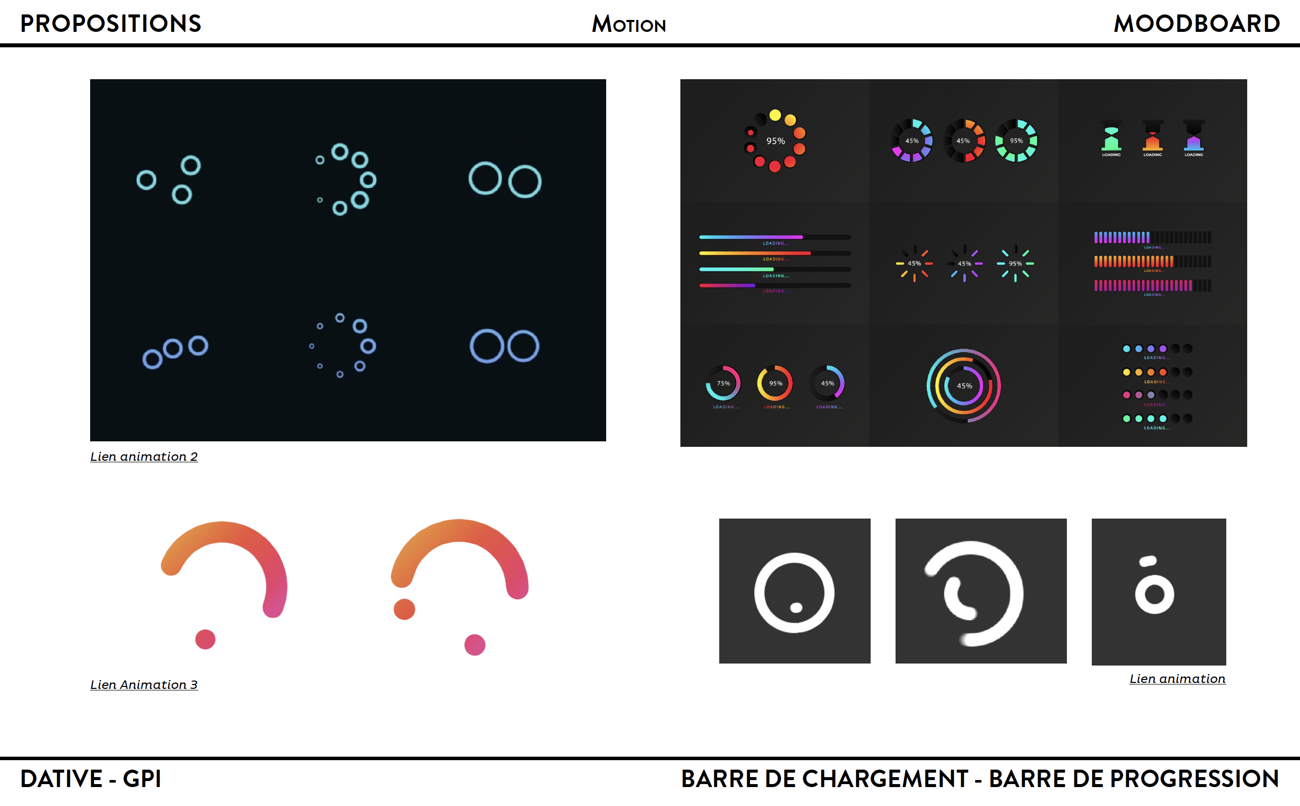 Le loader devait être dynamique et rond, apparaissant et disparaissant, permettant de créer une boucle. À partir de cela, conception d'un moodboard proposant plusieurs possibilités, puis, après une réunion de mise en commun, recherches de loader à l'aide d'AfterEffect.