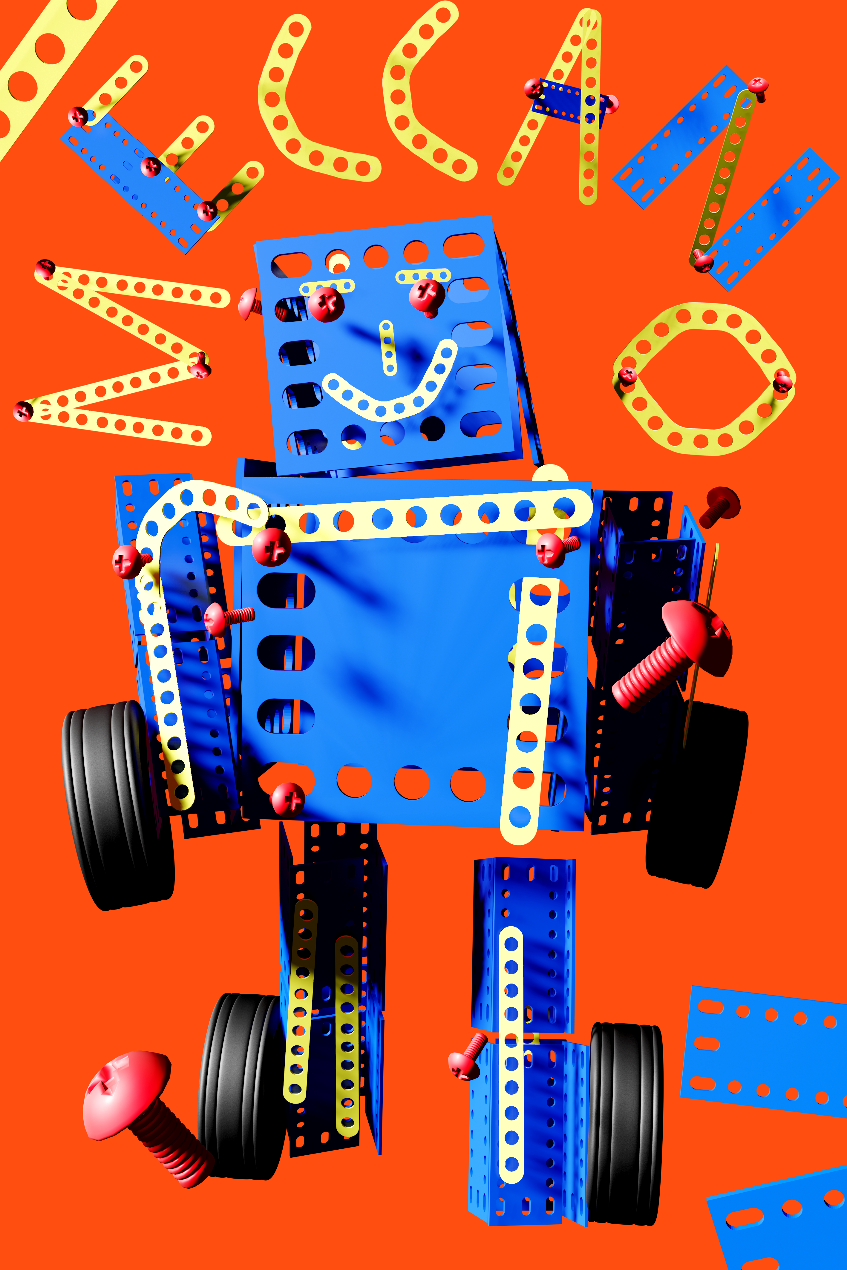 Les différents éléments de l'affiche sont construit a partir d'un répértoire de forme inspiré de la boite de jeu "Meccano", exposée au musée.