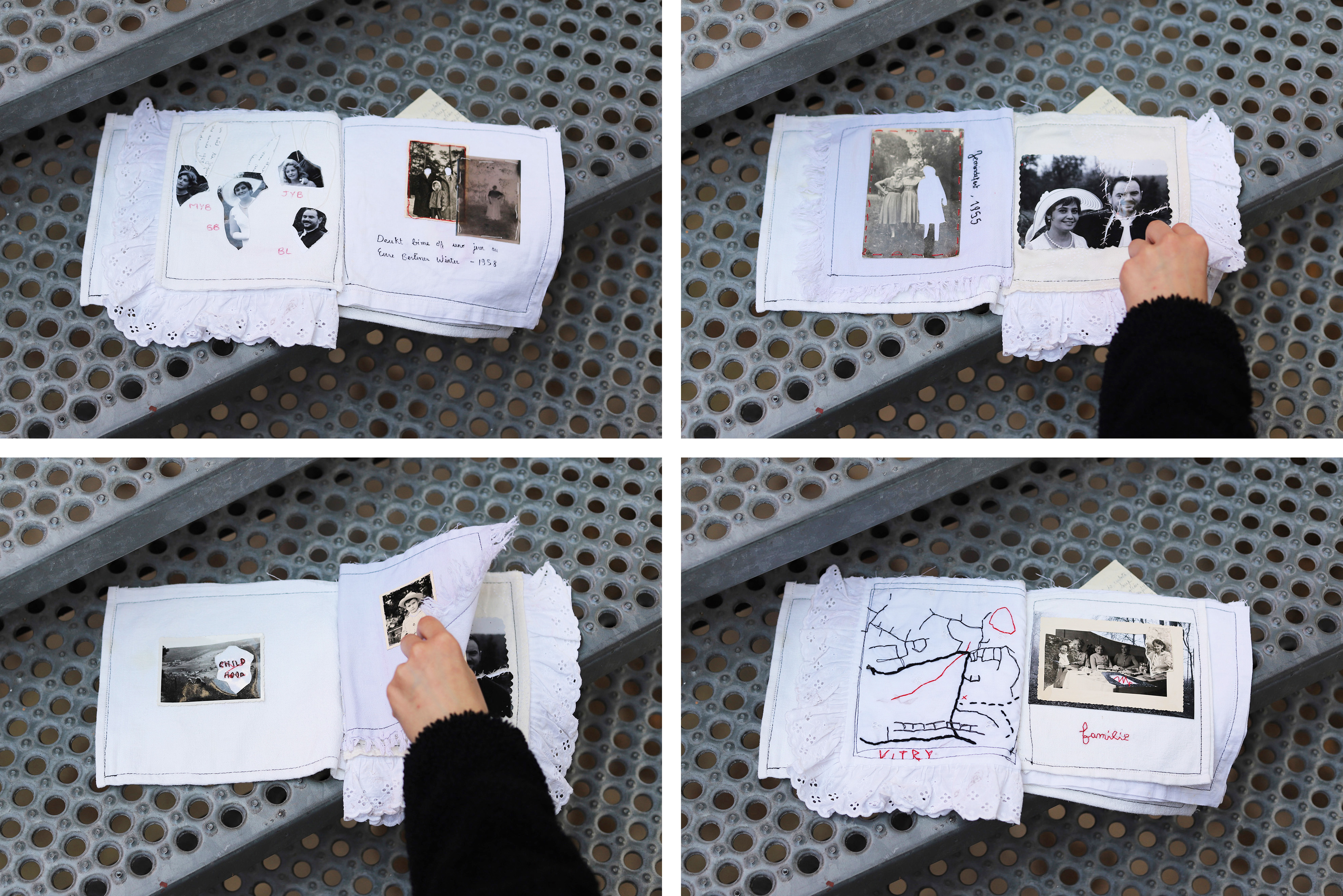 La broderie et les tissus ont permis de modifier ces photographies tout en restant dans l'archétype de l'album photo de famille aux pages abimées, petites annotations... Tout en effaçant les personnes décédées, les couples divorcés et en rendant l'objet sensible.