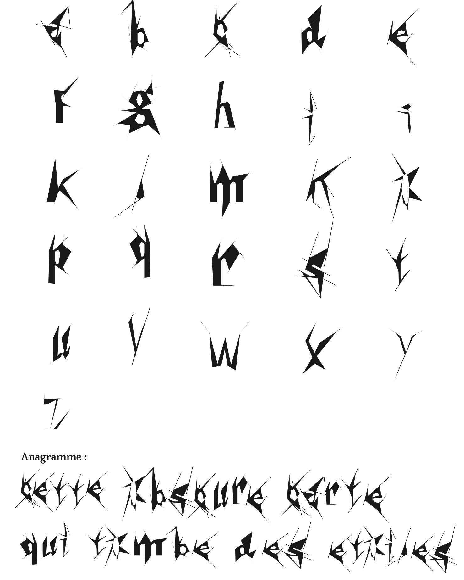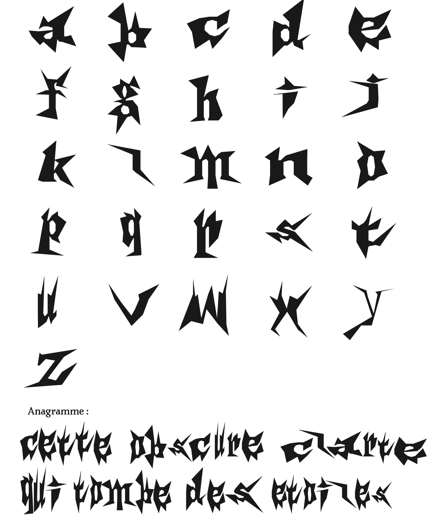 ✺ Elaboration d’un abécédaire Objectif : créer un outil de travail (la typographie) où je suis maître de son élaboration. Ici le style punk rock met en avant le désordre, la singularité, la colère.