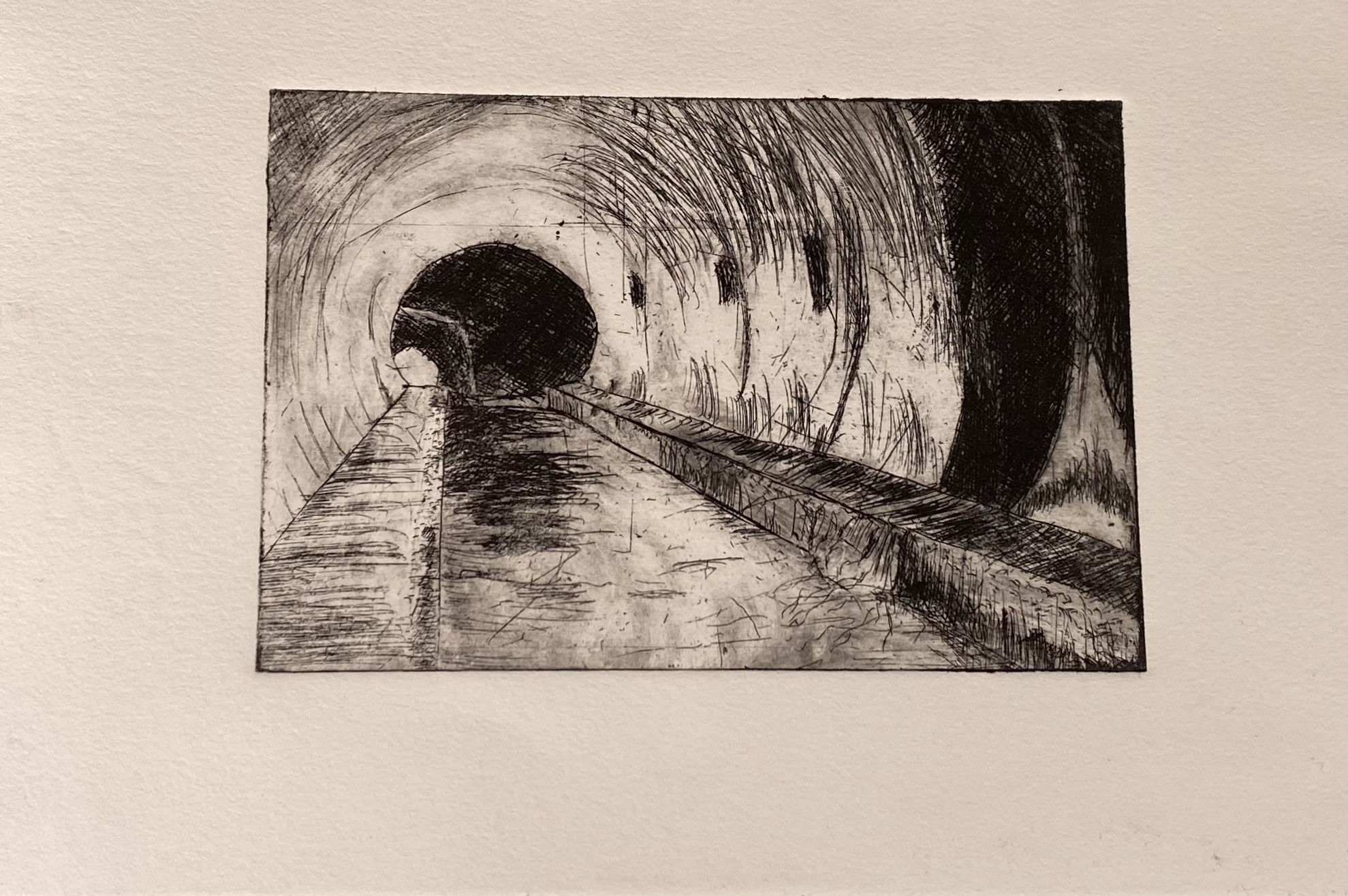 J’ai choisi un visuel de tunnel sombre afin de travailler les notions de clair/obscur, de luminosité et de profondeur. J’ai retravaillé ma plaque pour pouvoir obtenir un effet de l’eau différent de celui des parois.