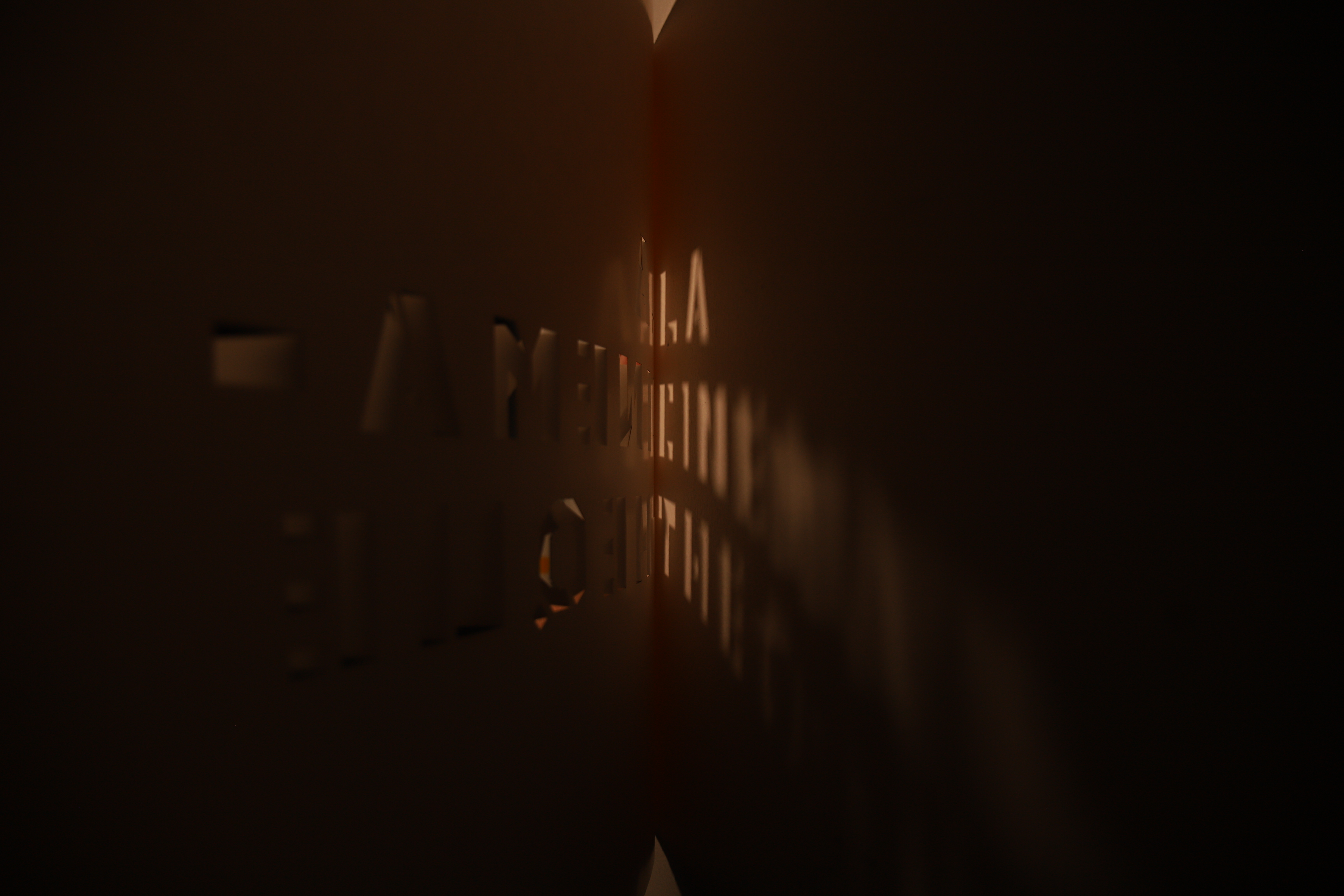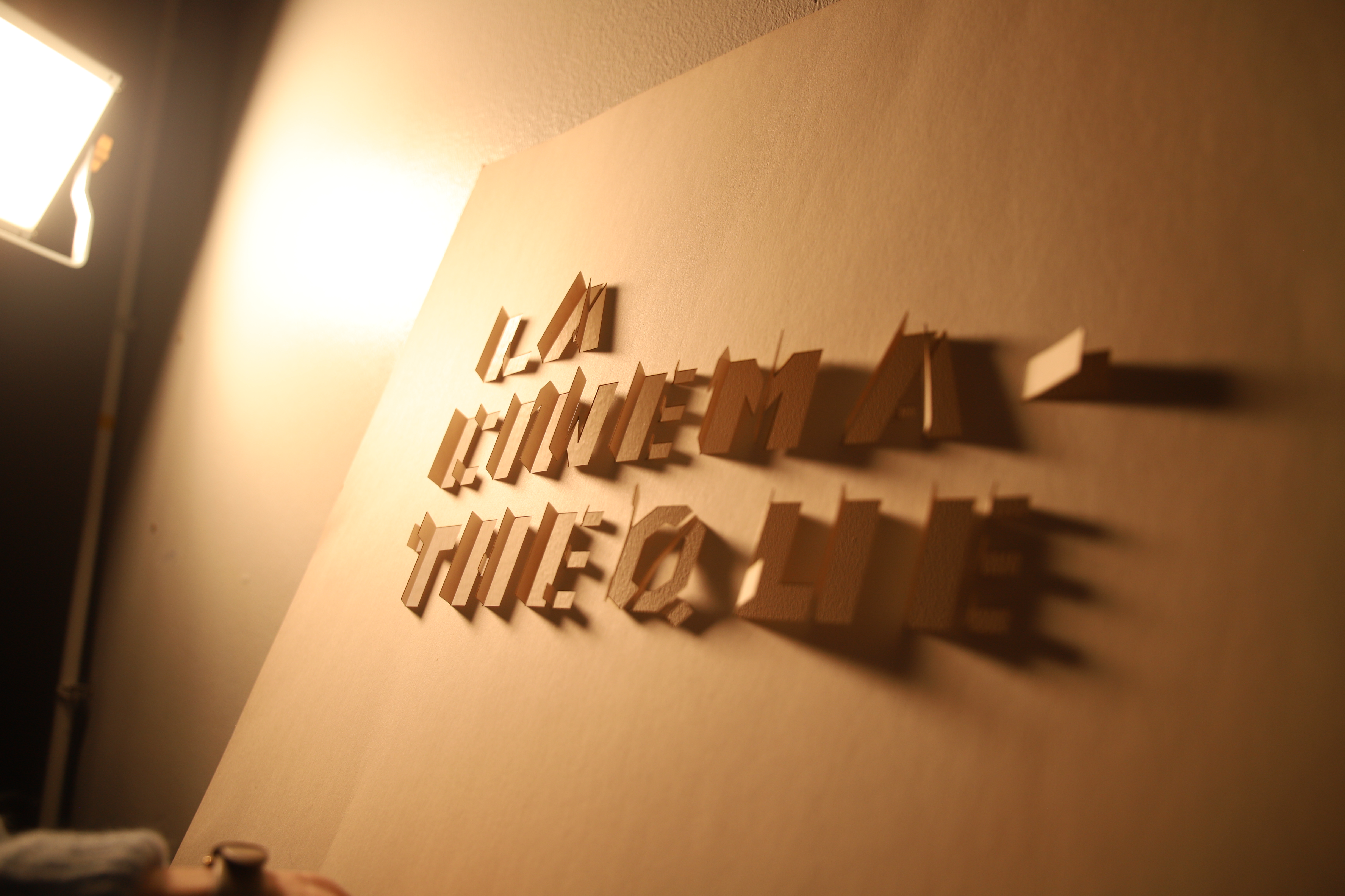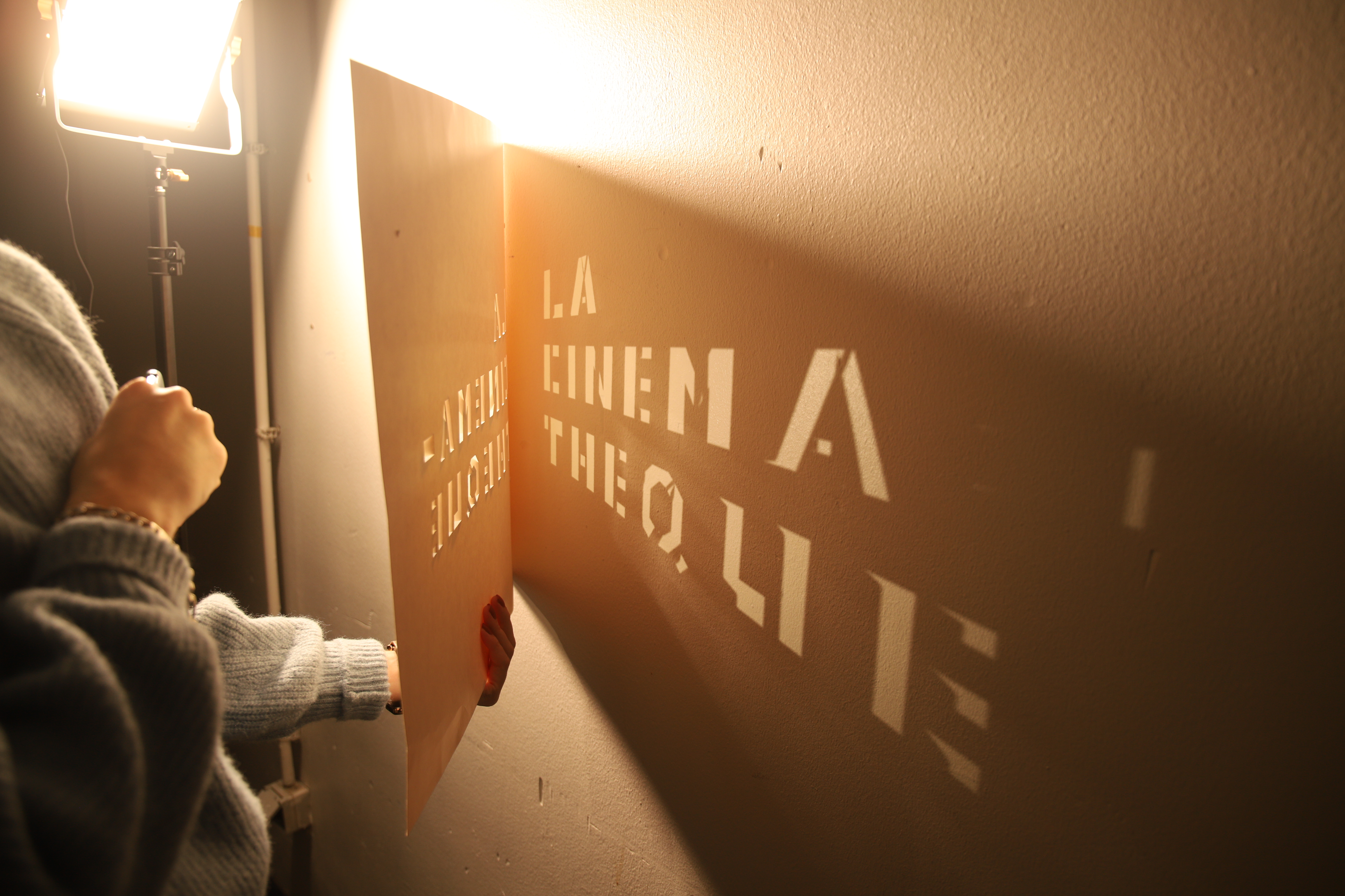 > Volonté de retranscrire la notion de cinéma à travers le jeu d’ombres et de lumières, la notion d’ateliers via le traceur laser et la notion d’enfant par les couleurs.