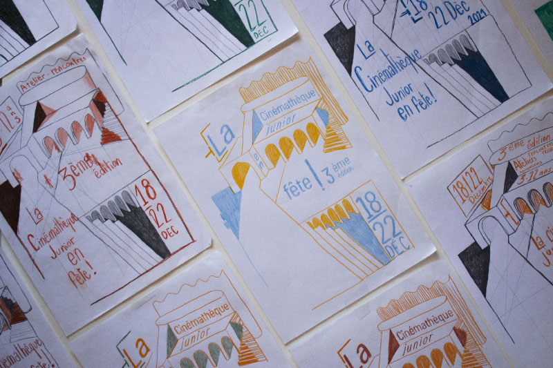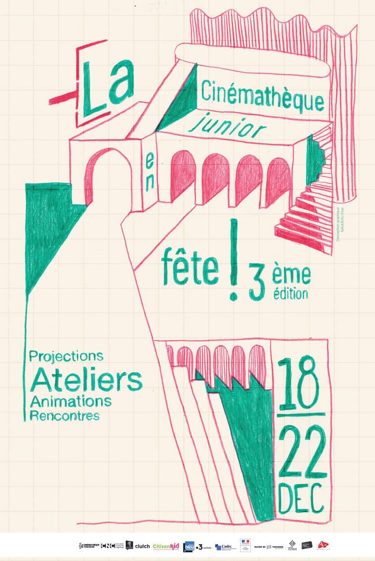 Création de l’identité visuelle de La Cinémathèque Junior en Fête!, organisé par La Cinémathèque de Toulouse. L'aspect architectural renvoie autant à la composition graphique qu'au cinéma. Le traitement "traditionnel" renvoie à la dimension manuelle des ateliers mais aussi au travail des réalisateurs précurseurs Le dépliant se compose de 2 feuilles, superposés, sur les deux côtés se trouvent des marques-pages (évitant ainsi les chutes).