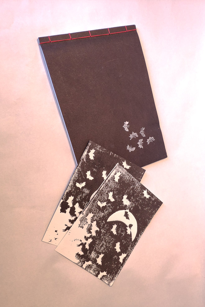 Création d’une mini édition promotionnelle pour la 25ème Nuit de la Chauve-souris porté sur la prévention et la protection de cet animal. Mon intention dans cette linogravure était de mettre les chauves-souris en lumières par un contraste noir et blanc pour les faire surgir de l’ombre. La carte postale, choisie comme support de diffusion, est donc totalement envahi par ces animaux. J’ai également relié un petit carnet pour pouvoir répertorier mes recherches graphiques sur les chauves-souris.