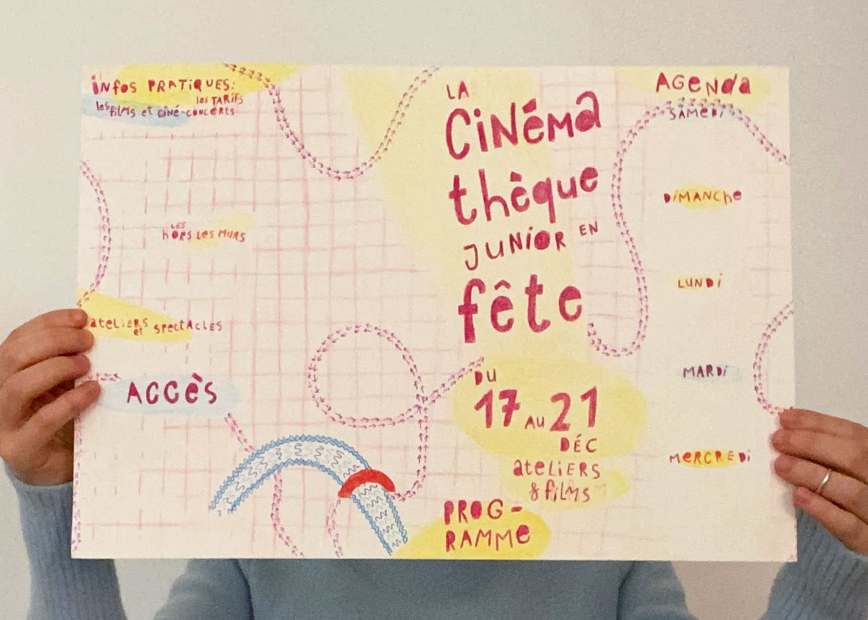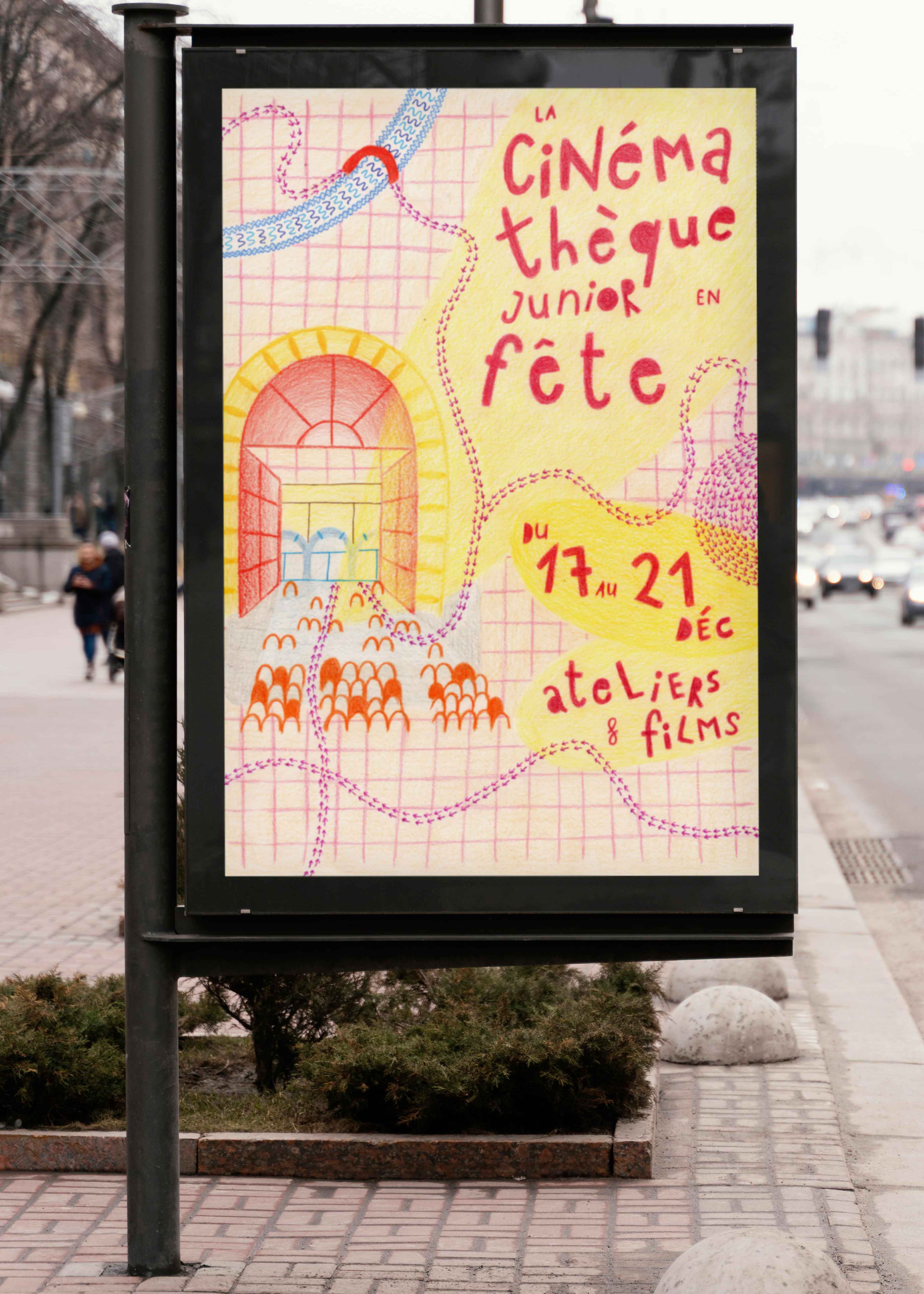 C’est alors que j’ai choisi de travailler en 2 parties, j’ai d’abord travaillé pour la cible des parents et grands-parents… Je voulais que la cinémathèque soit reconnaissable comme un lieu emblématique de Toulouse, pour moi, lors de notre visite, l’élément phare qui m’a le plus interpelée c’est la grande cour, avec cette grande porte rouge tout devant. J’ai alors choisi de m’en inspirer et d’en faire mon égérie pour mon l’affiche.