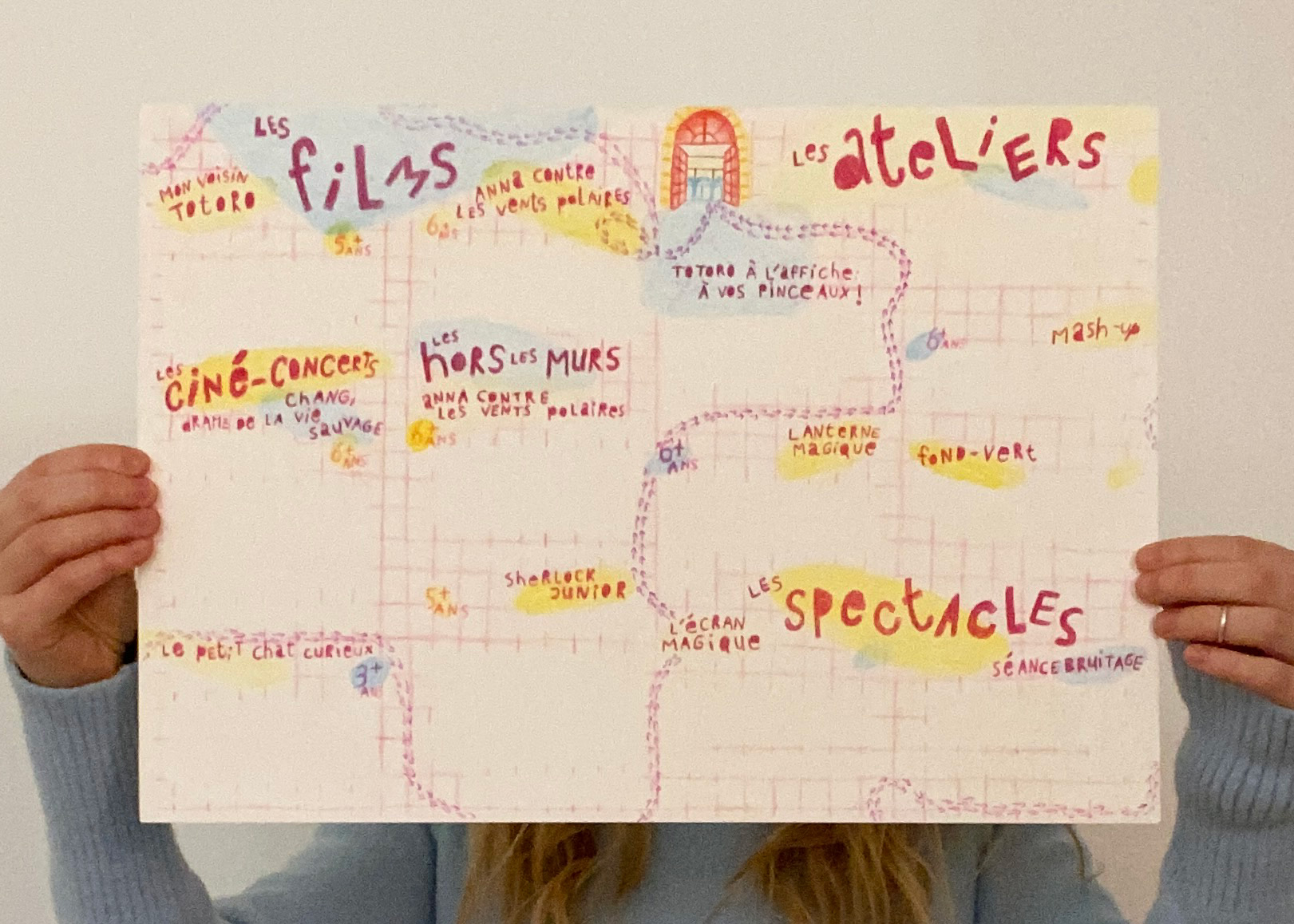 Ensuite, pour la cible des enfants, je me suis inspirée des ateliers proposés, particulièrement de ce coté fait à la main qui revient sans cesse. C’est alors que m’est venu l’idée de faire mon affiche et mon dépliant tout à la main, comme le montrent si bien les ateliers, comme celui de Totoro, à vos pinceaux!