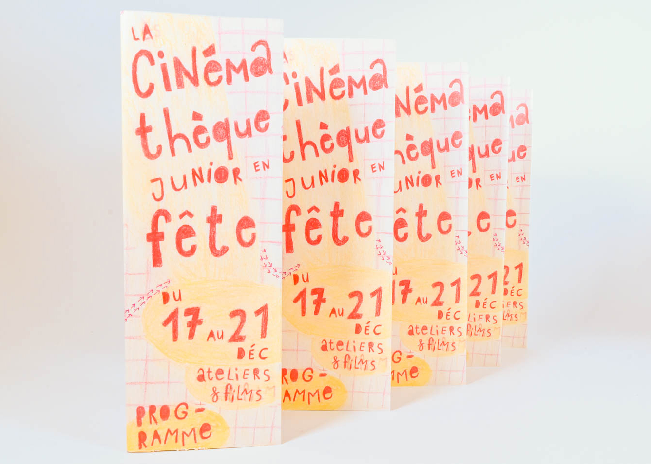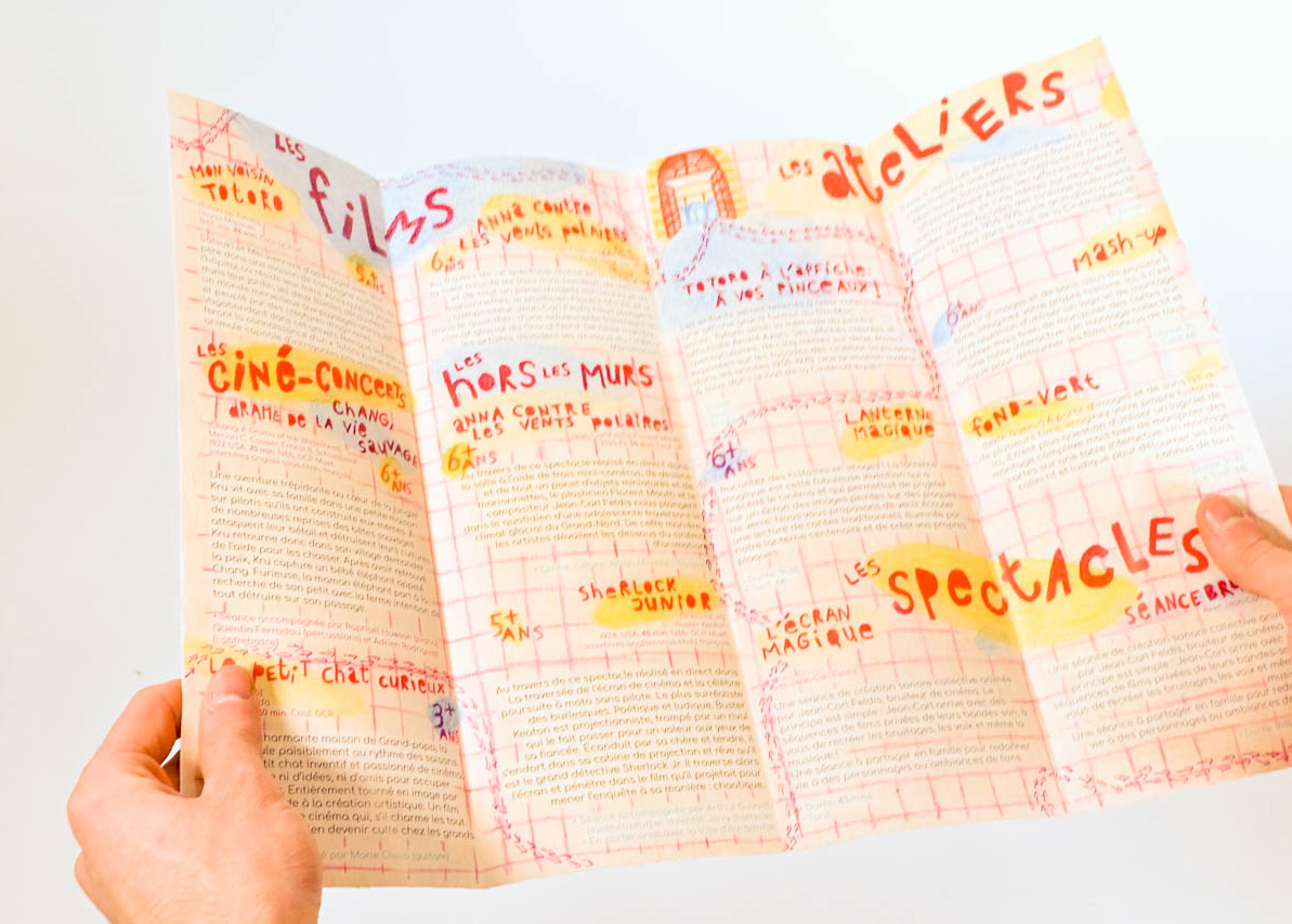Le dépliant fonctionne de la même manière que l’affiche, grâce aux flèches c’est une invitation à découvrir la programmation, ainsi que la cinémathèque par la même occasion.