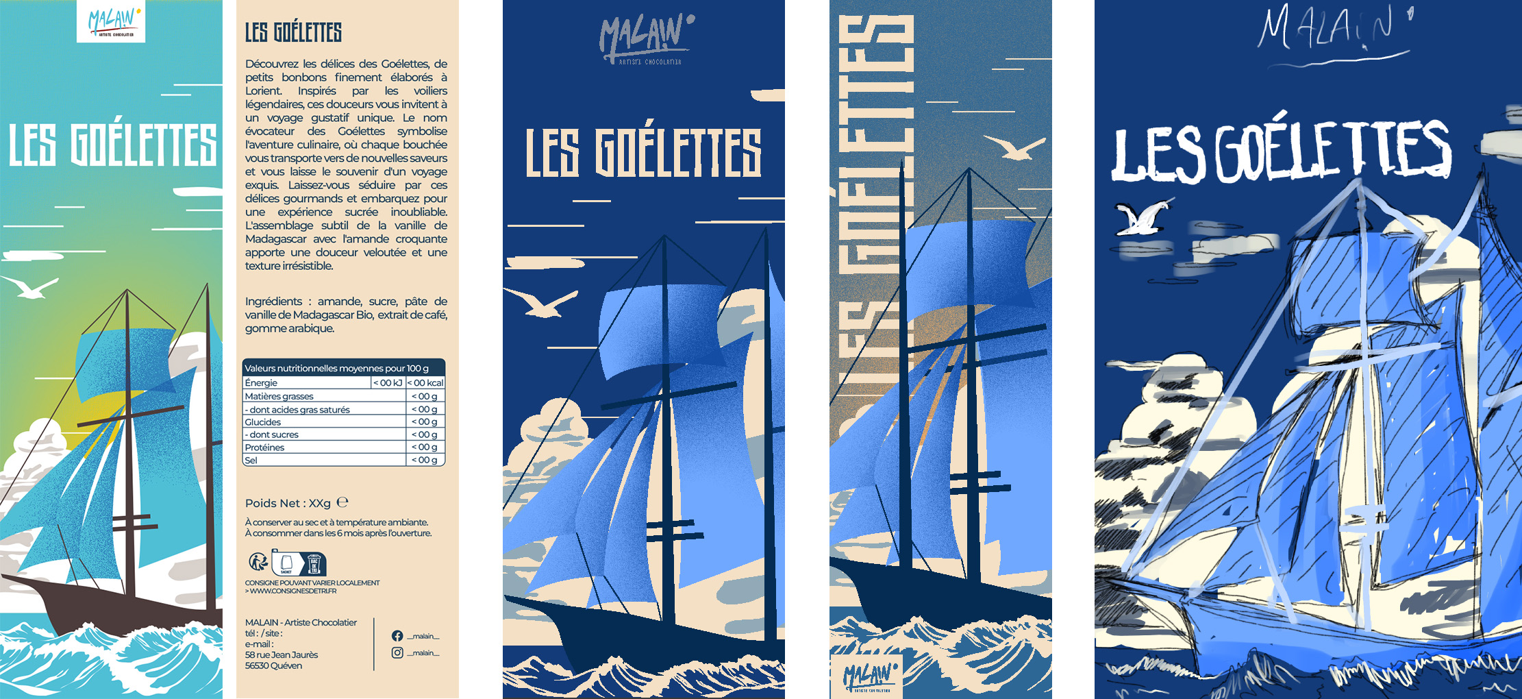 During my internship at Studio M-A, I was charged to design the identity of a chocolate maker : Malain. The chocolate artist needed a new logo and an adaptable graphic charter for his packaging. I worked on several logo researches and created a packaging taht included a label to be attached on plastic packaging.