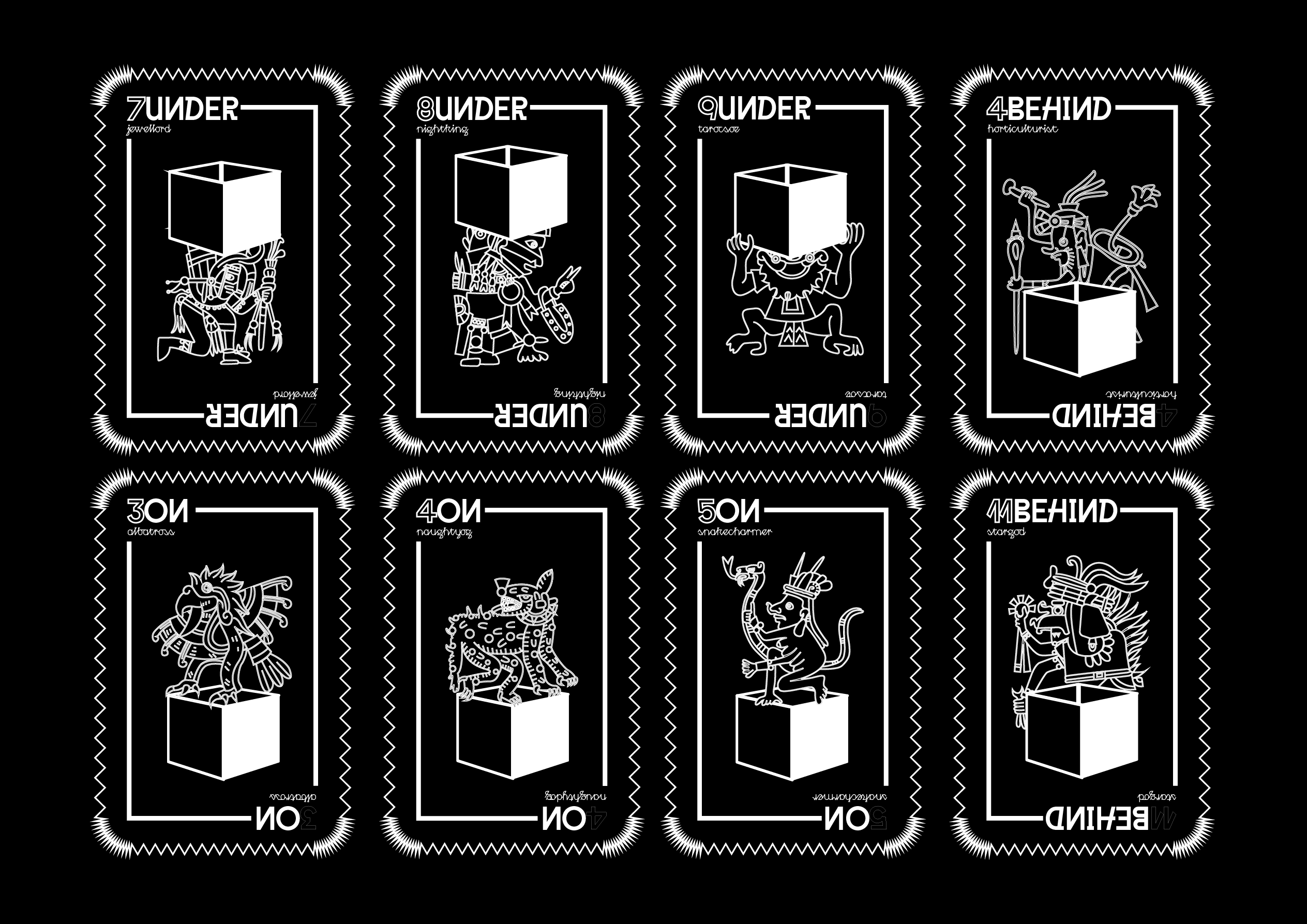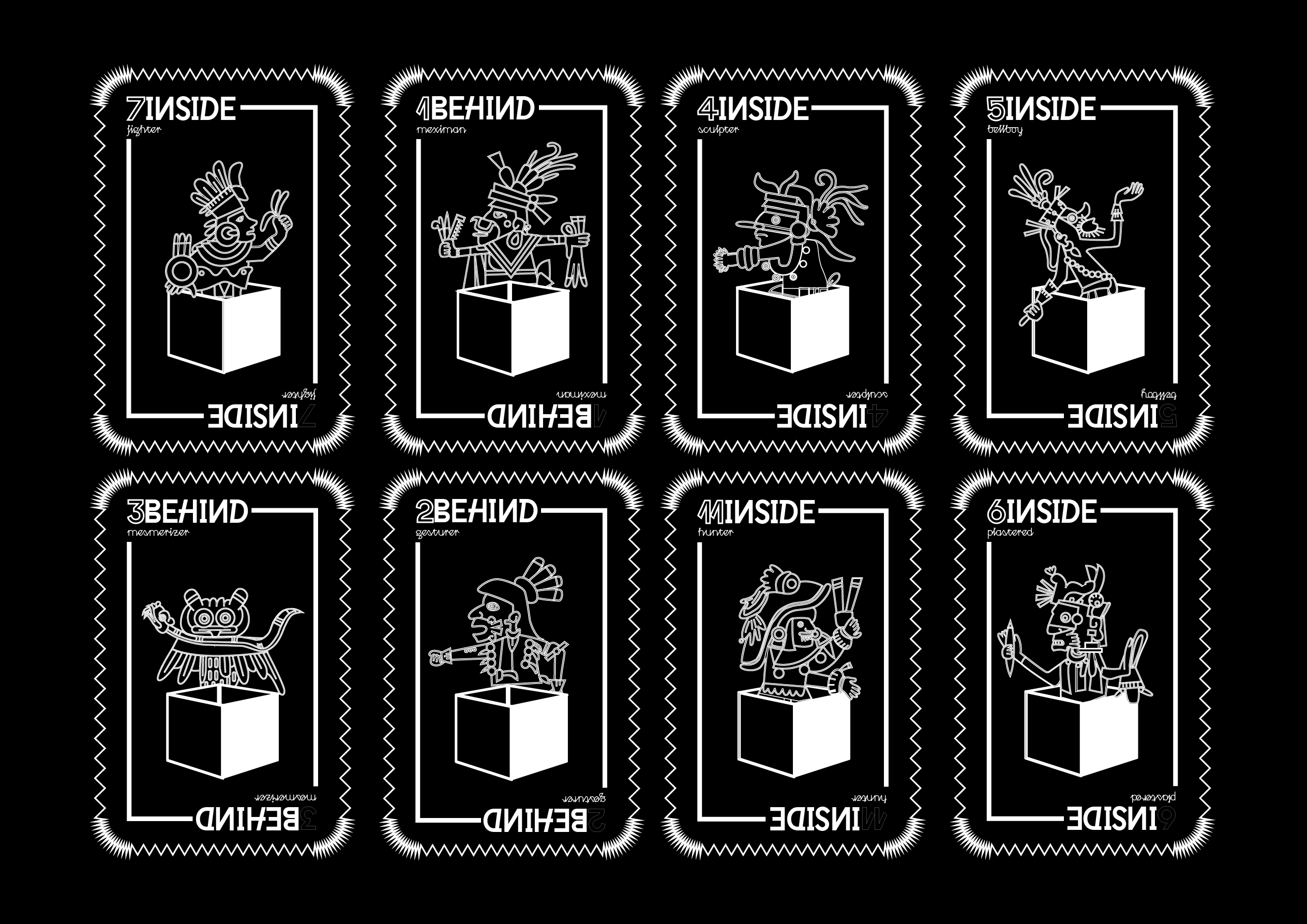 L’étape d’illustration des faces des cartes a été la plus longue, car il fallait repenser plus de 40 illustrations représentant des personnages et leurs rôles dans la société aztèque. Le design choisi est sobre, avec des contours doublés et des motifs rappelant ceux de la face. Chaque carte présente une illustration en contour, accompagnée d’une typographie miroitée à vocation informative.