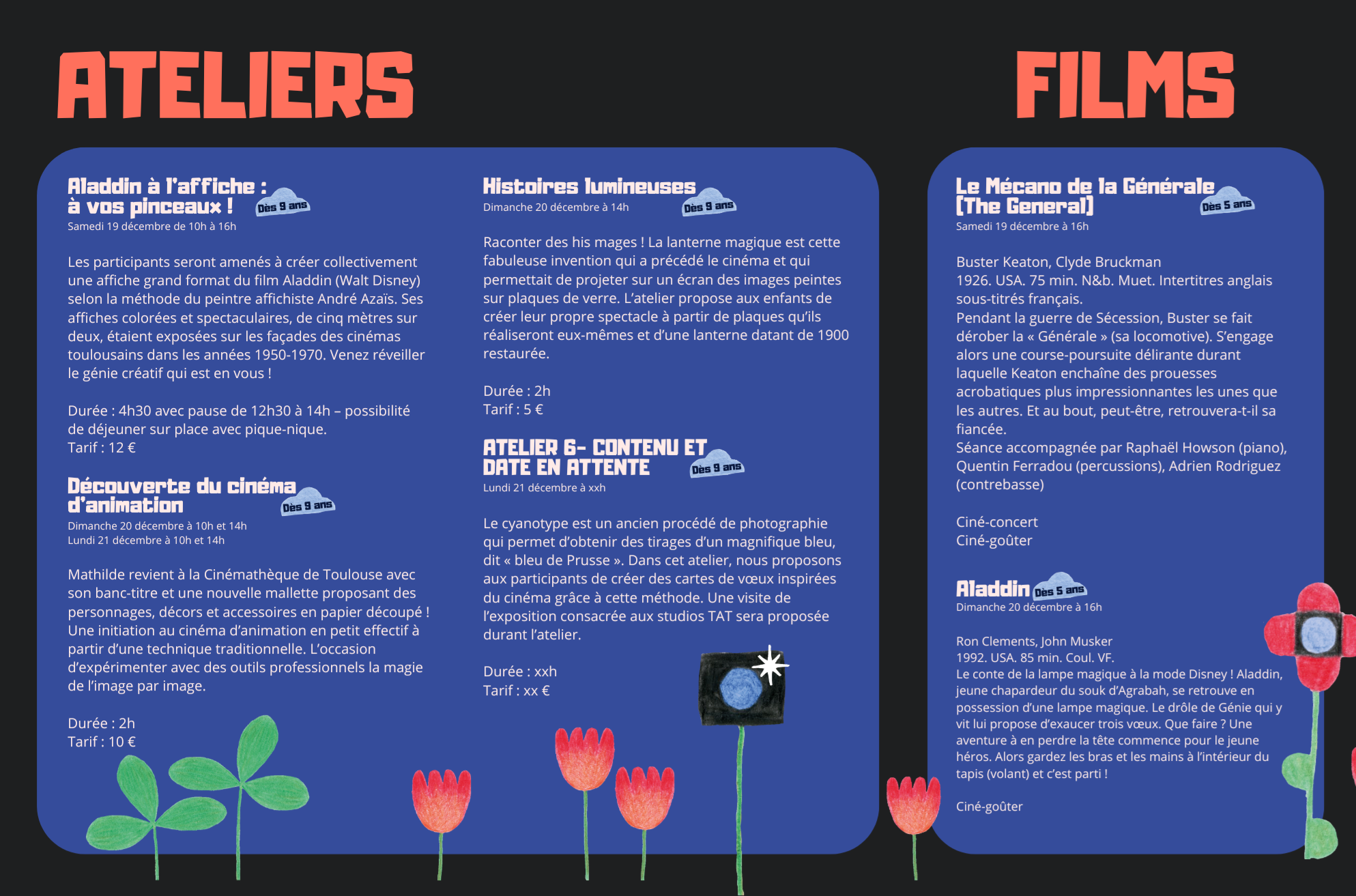 La Cinémathèque de Toulouse prévoit chaque année un énènement spécial, “La cinémathèque junior en fête !”. Cet évènement a pour objectif de faire découvrir aux enfants l’histoire du cinéma à travers des ateliers créatifs et des projections de films.