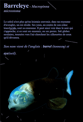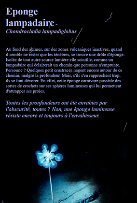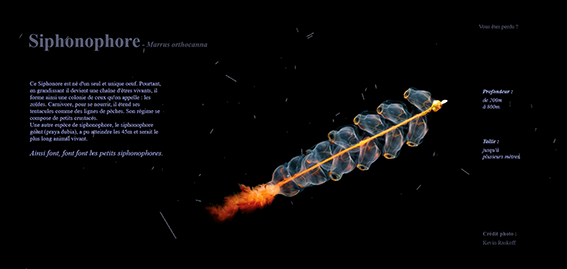 Un site internet composé de dix articles, autour d'espèces marines bioluminescentes. Un voyage sous la mer entre obscurité et lumière, à la recontre d'habitants dont on ne soupçonnerait pas l'existence.
