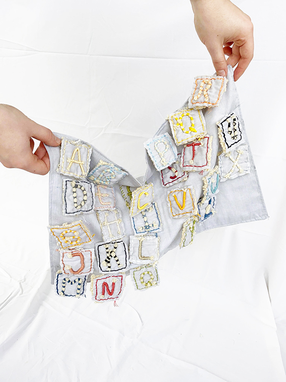 Avec une contrainte d’utiliser l’intégralité de la matière d’un vieux pull, j’ai décidé de décliner sa fonction sous un livre en tissu contenant un abécédaire en relief par l’usage de la broderie. Pour le créer, j’ai démaillé une partie du pull pour m’en servir comme fil conducteur de ma lettre, j’ai ensuite brodé autour de la laine avec la broderie pour créer sa forme finale. Ce projet m’a ainsi servi comme support d’exploitation à l’usage d’un jeu de manipulation pour l’expérience de l’atelier avec les jeunes enfants de l’institut des jeunes aveugles (cf projet