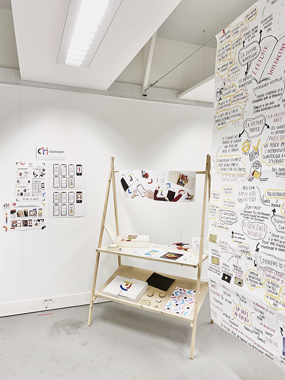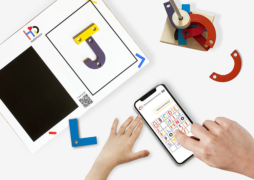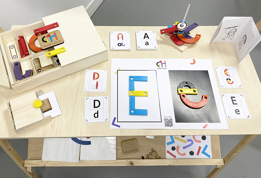 Après un travail théorique autour de l’apprentissage, la lecture et de la malvoyance, le projet graphème est né, il se présente sous forme d’outil de médiation pédagogique (une mallette) visant à exprimer sa créativité au cœur d’un processus d’apprentissage. Apprendre à l’enfant la constitution des différentes formes qui composent une lettre. Des formes en bois de couleurs permettent aux jeunes malvoyants de pouvoir recomposer les formes selon leur envie et créativité. Le kit est composé de plusieurs éléments : une notice, un tapis de jeu illustré, des formes en bois colorés, un totem de rangement et des cartes de références. En scannant le QRcode, l’enfant peut retrouver l’extension mobile qui lui permet de numériser son alphabet graphique.