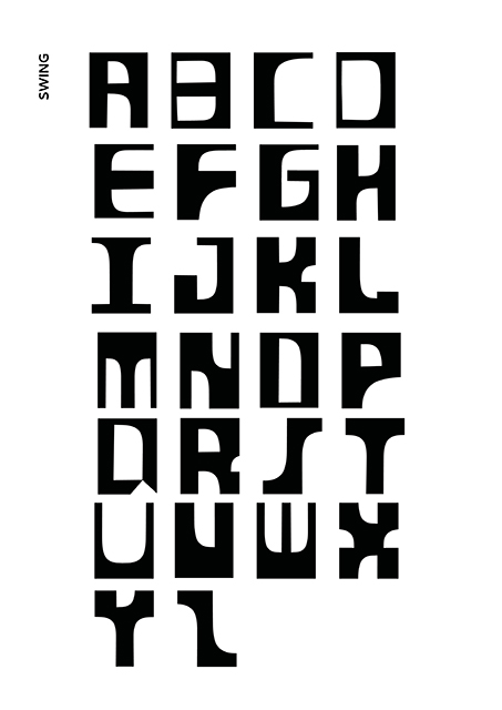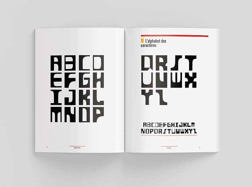 En partant d’un extrait musical, le choix de trois formes et un gabarit de référence, j’ai réalisé une identité graphique autour d’un caractère typographique se nommant « SWING ». Sous des allures d’un style rétro. Ainsi, afin de présenter cet univers, j’ai réalisé un spécimen typographique dans un protocole de mise en page sur le logiciel InDesign réalisé par mes soins.