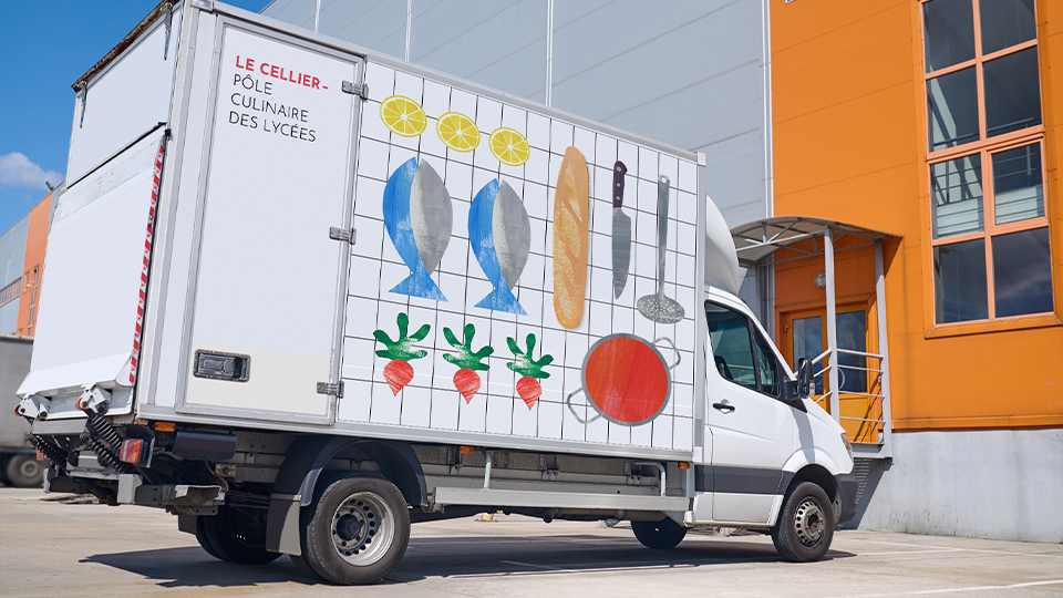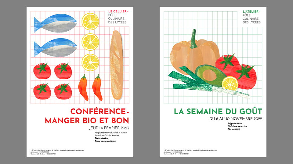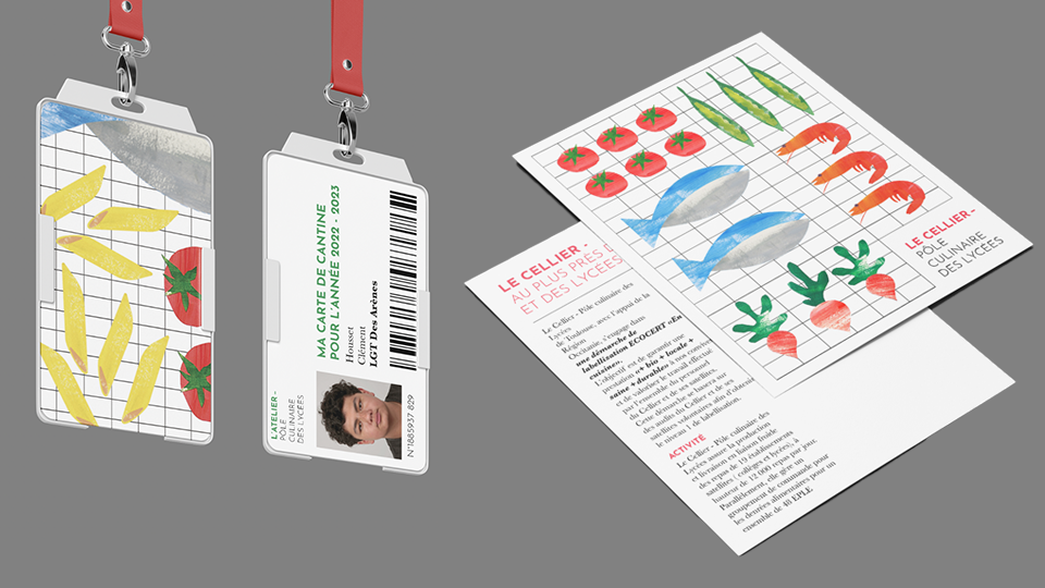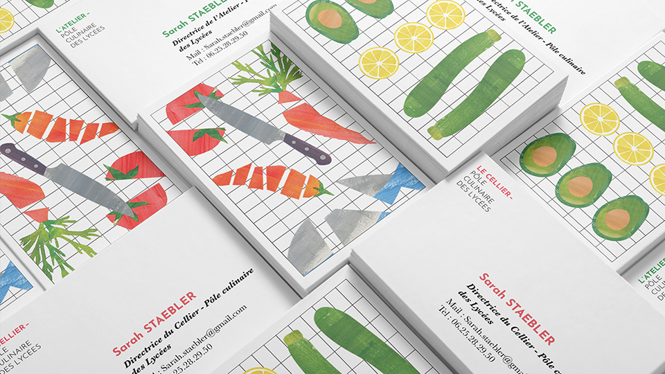 L’identité a été imaginée comme une recette culinaire : à partir de matières premières (aplat de peinture) que nous avons émincées, découpées et assemblées afin de réaliser des ingrédients graphiques (illustrations). Enfin, nous les avons mis en scène à travers un système graphique (plan de travail matérialisé sous forme de grille). L’identité se divise en 2 pôles : - L’atelier : destiné au grand public - Le Cellier : destiné au fournisseur Dans la communication destinée au Cellier, les ingrédients graphiques sont rangés et entiers. Et dans celles destinées à L’Atelier, les ingrédients sont mis en scène sur une planche à découper, dans une assiette ...