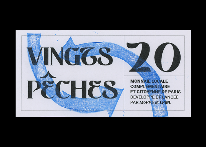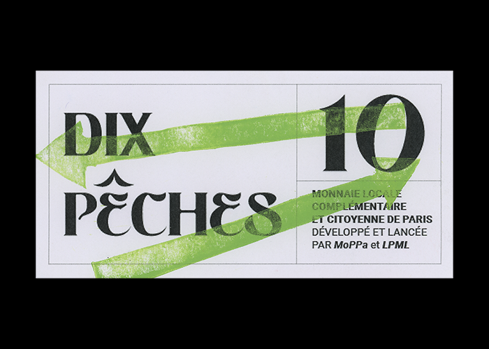 Refonte de l’identité de la monnaie locale de Paris : la Pêche. J’ai souhaité redonner une dimension plus humaine au paiement en utilisant des signes graphiques symbolisant l’échange. La linogravure permet d’explorer les notions de lisibilité et illisibilité de la lettre, pour créer un contraste entre la monnaie fiduciaire (que l’on voit) et électronique (que l’on ne voit pas).