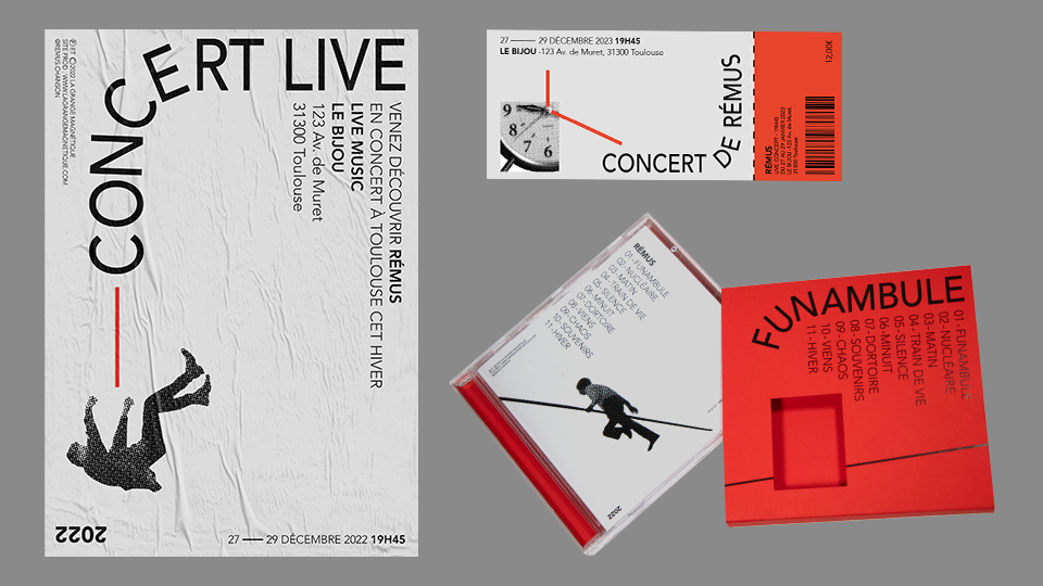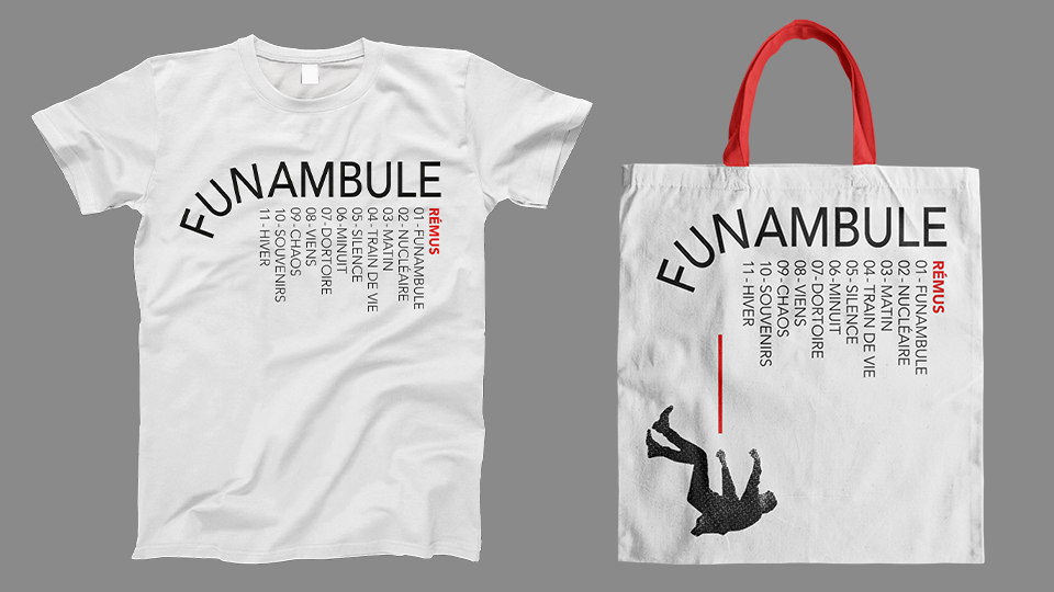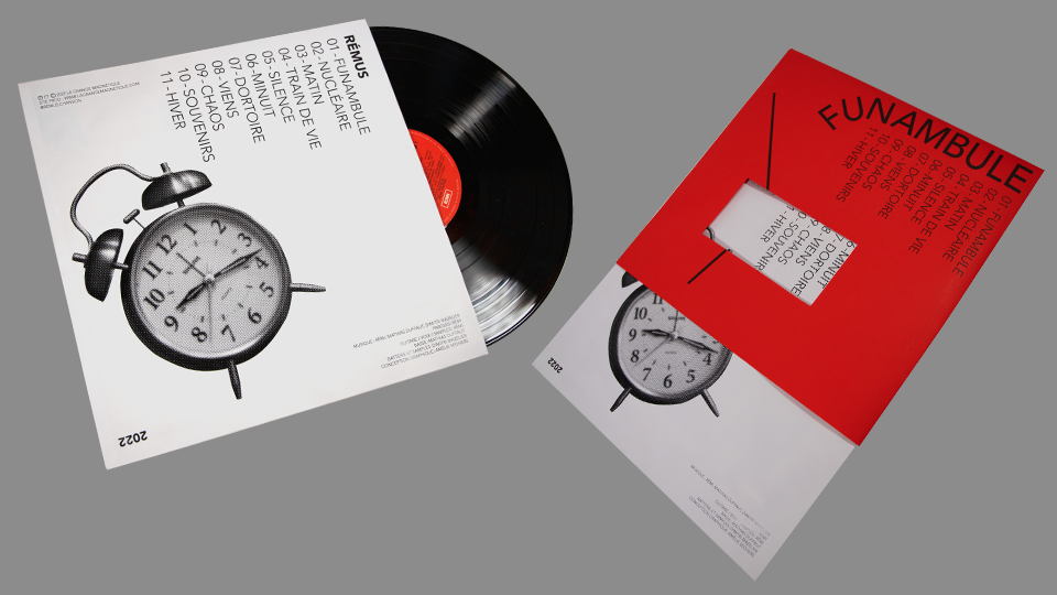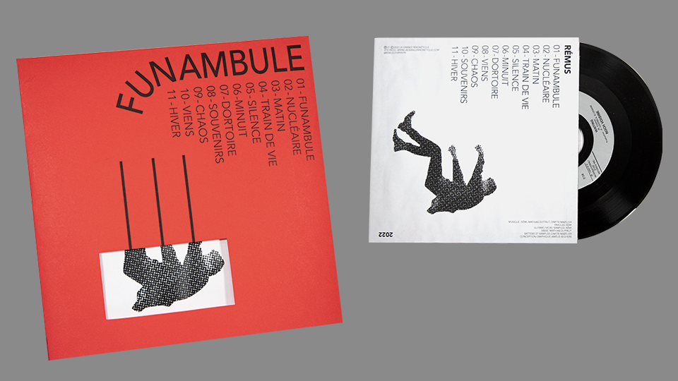 J’ai souhaité retranscrire la notion de vertige grâce aux blancs tournants. Le but était également de faire perdre ses repères au lecteur grâce au sens de lecture de la police de caractère. Cet effet est renforcé par la manipulation des vinyles et CD qui aborde la notion de chute et de perte d’équilibre. La police de caractère est quant à elle géométrique et stable ce qui permet de créer un contraste.