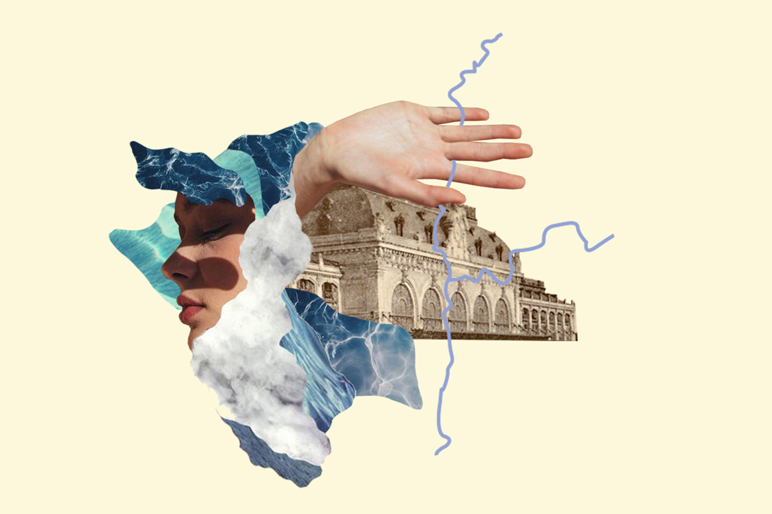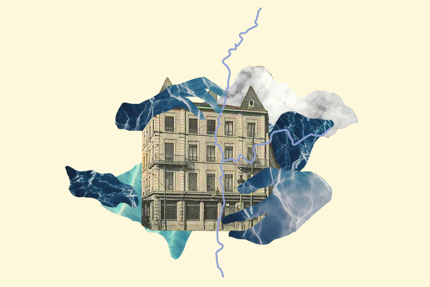 Réflexion et recherches graphiques de collage sur l’exposition 2019 de la biennale de Lyon. Ce paysage traversé et traversant est aussi celui d’un glissement qui marque l’apogée de l’âge industriel en Europe et son achèvement spéculatif au cours du XXIe siècle. Là où les eaux se mêlent est ainsi comme un paysage plissé où chaque vague et chaque crête, chaque variation, ouvre sur de nouvelles perspectives et mises en relation.