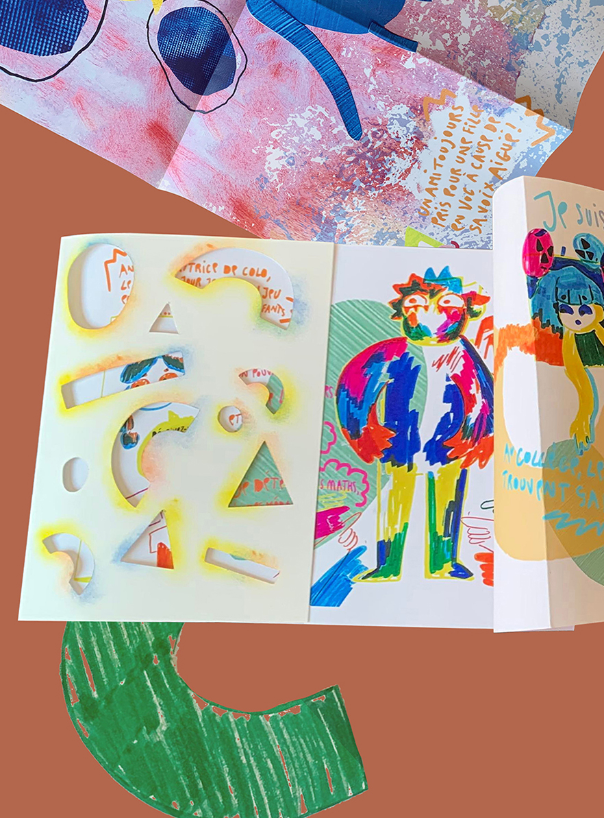 Entre couleur et genre, ce projet raconte dans le dessin diverses anecdotes genrées. Il a pour objectif de sensibiliser aux stéréotypes de genre et favoriser leur mixité afin de permettre un mieux être de ces jeunes individus. Le leporello-zine contient également des posters anecdotes dont les visuels ont été réalisés par des élèves de CM2 de l’école primaire Mounet Sully à Saint-Astier. Je suis partie sur un format tout en longueur sans transitions marquées pour donner de la fluidité. Quant aux couleurs, je l’ai posée sans réfléchir afin de m’éloigner le plus possible des clichés, et permettre de créer différents mélanges riches en textures.
