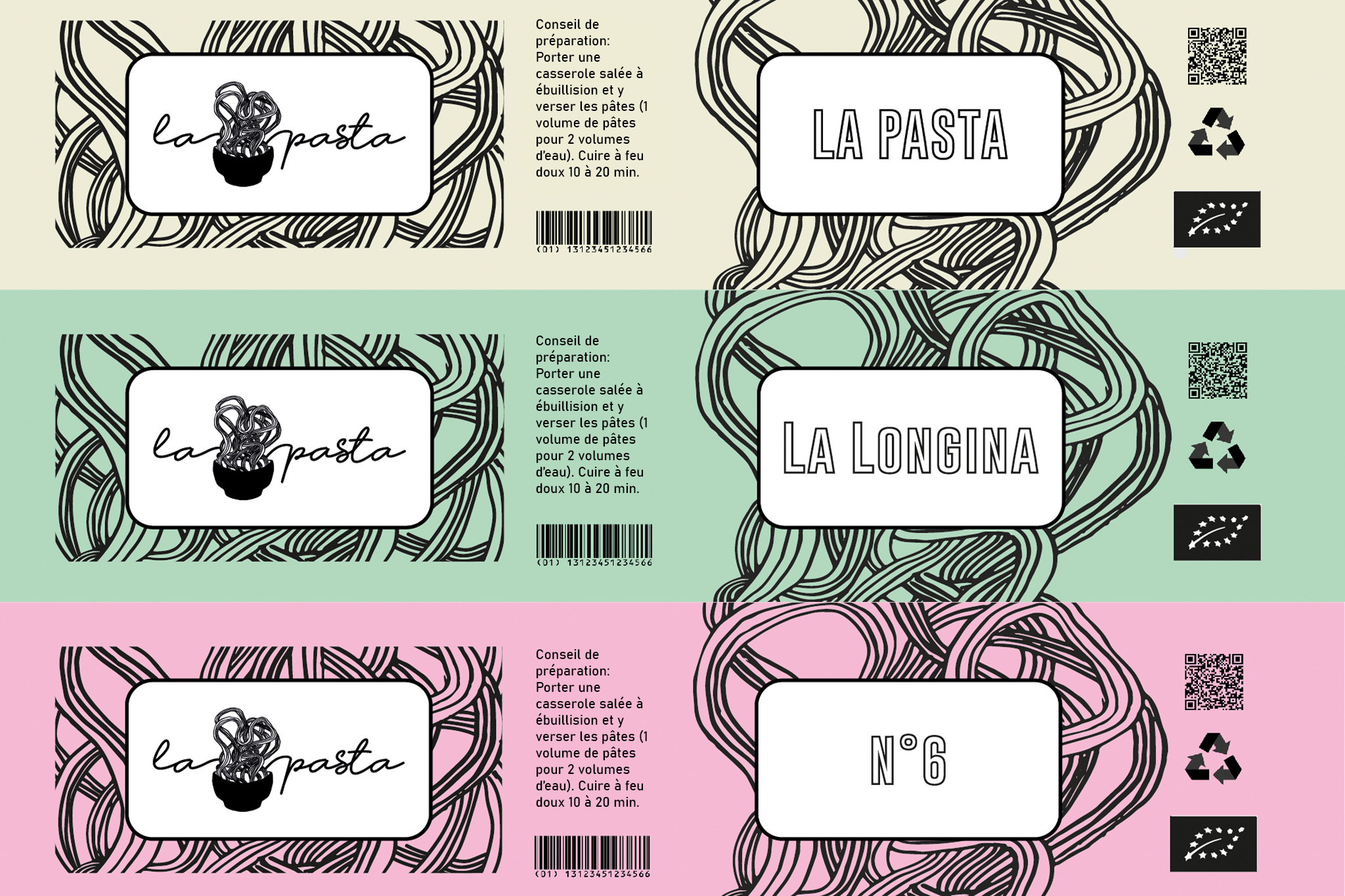 Identité fictive pour une marque de pâte nécessitant un logo lisible qui s’adapte à différents modèles. (Réalisé durant mon stage avec Behnam Olivier)