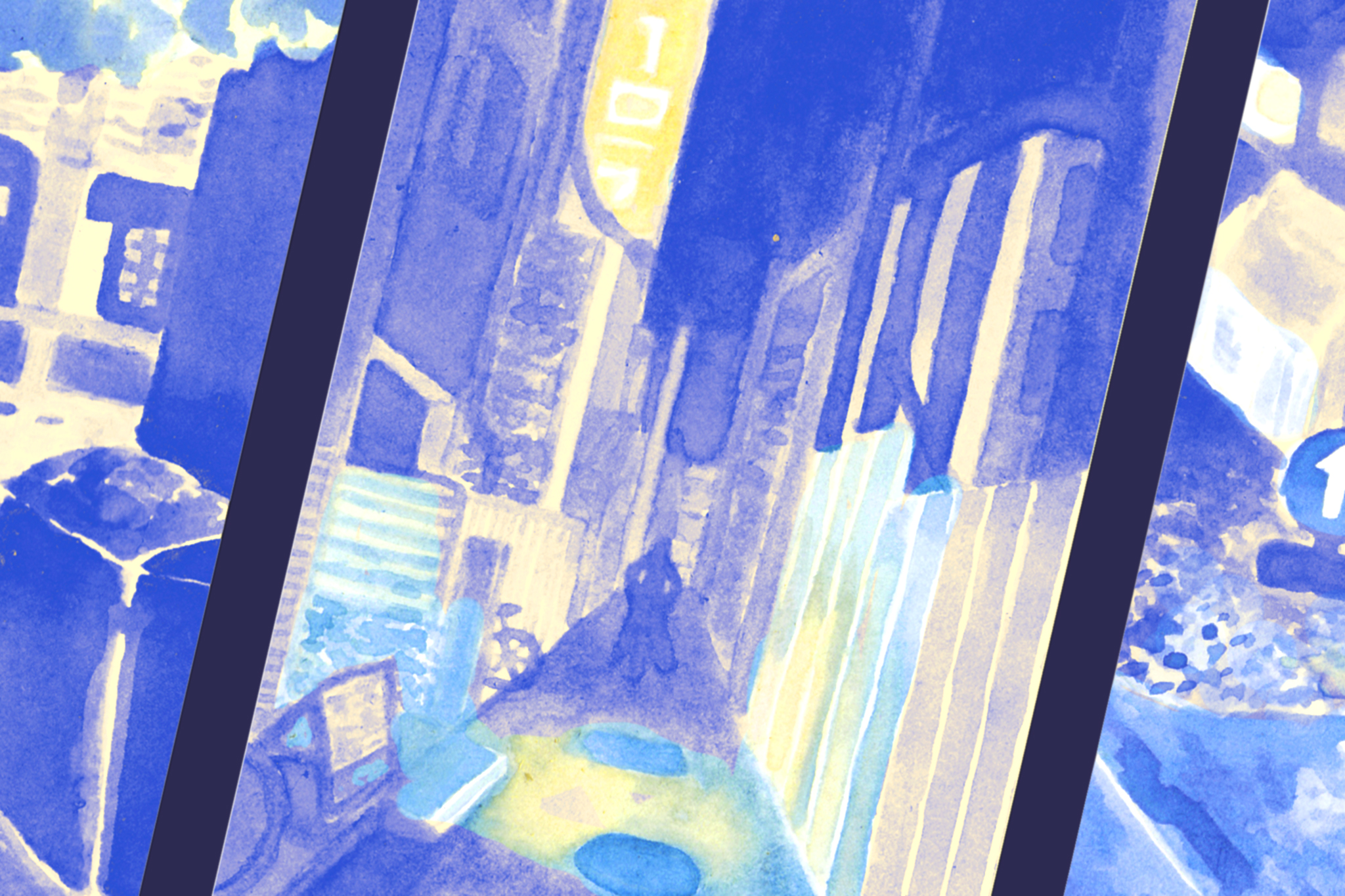 Peinture la ville de Tokyo de nuit à partir d’encres végétales faites à la main. Bichromie de la nuit et travail sur le principe de la synthèse soustractive.