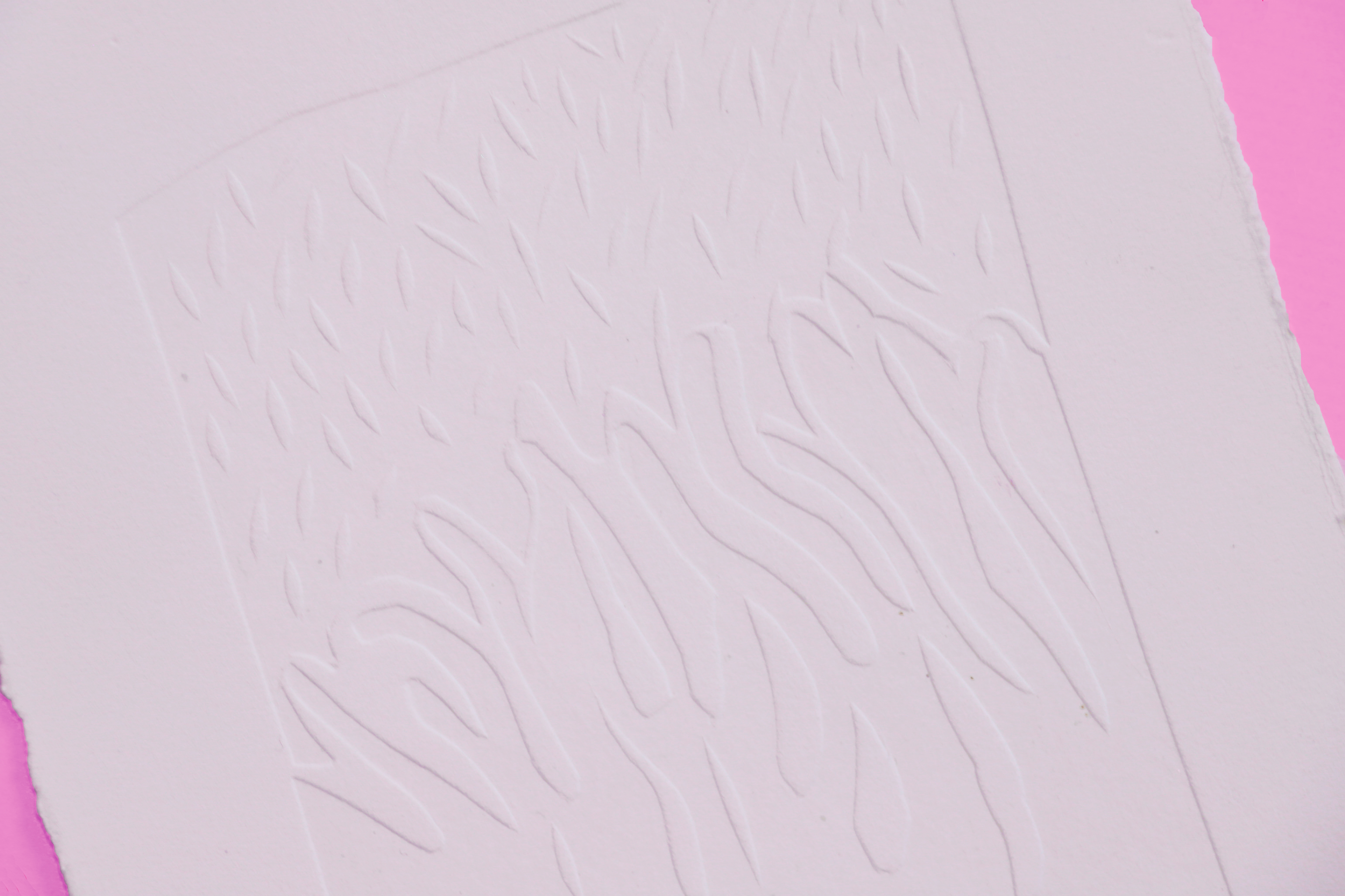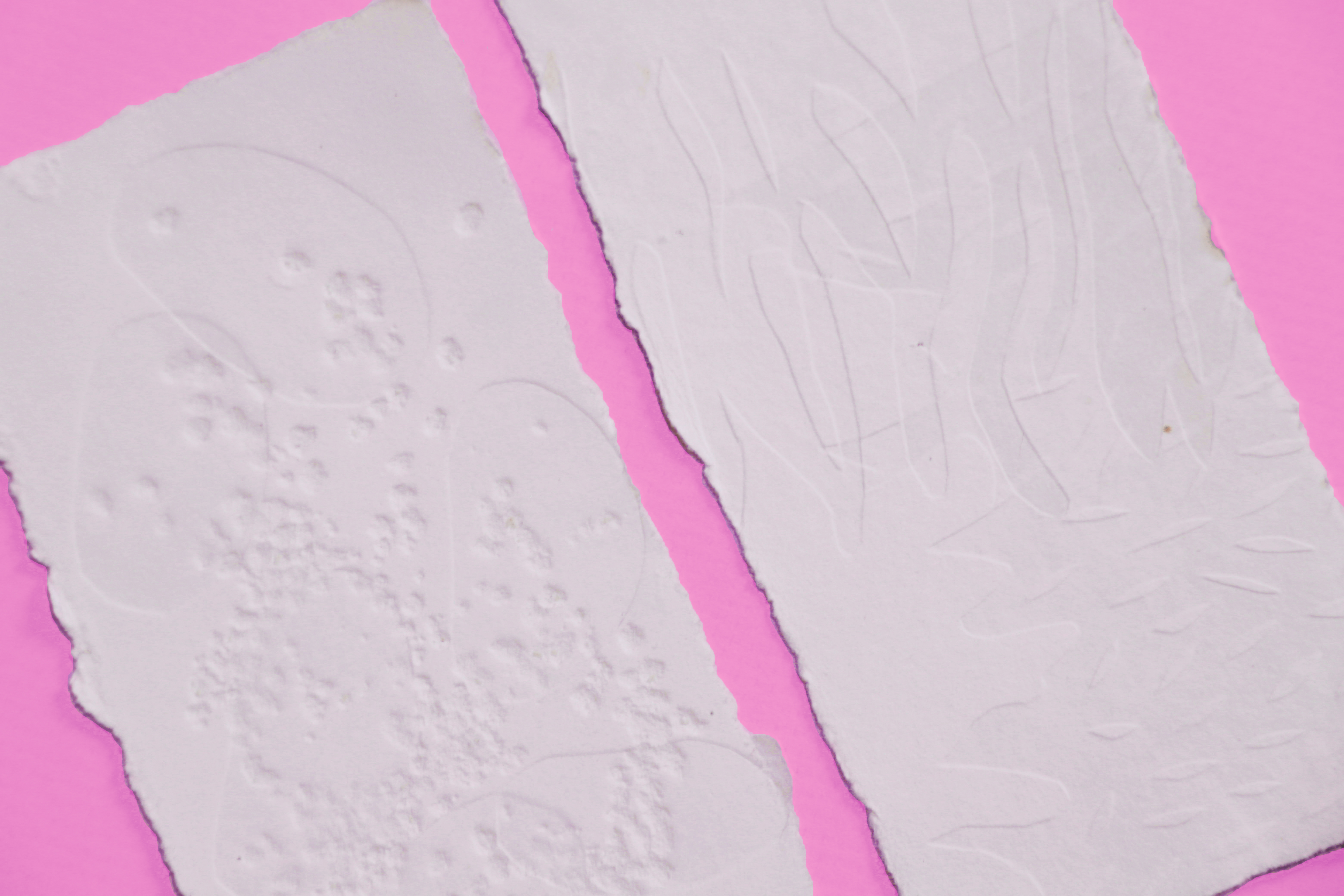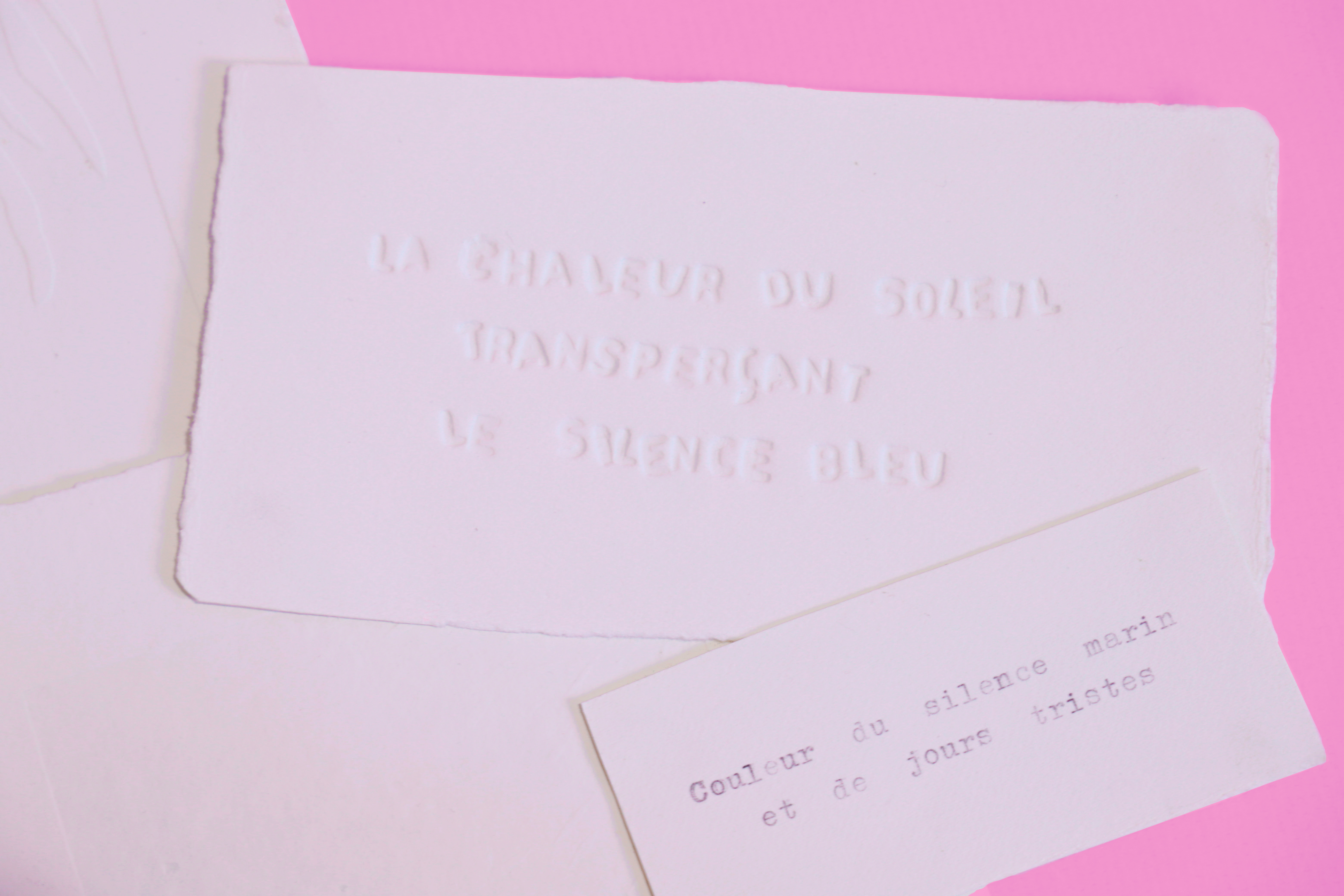 Travail sur la relation entre ombres et lumières et la composition qu’elles permettent. Les expérimentations de gaufrage sont réfléchies en fonction de la sensibilité du toucher reposant sur la synesthésie.