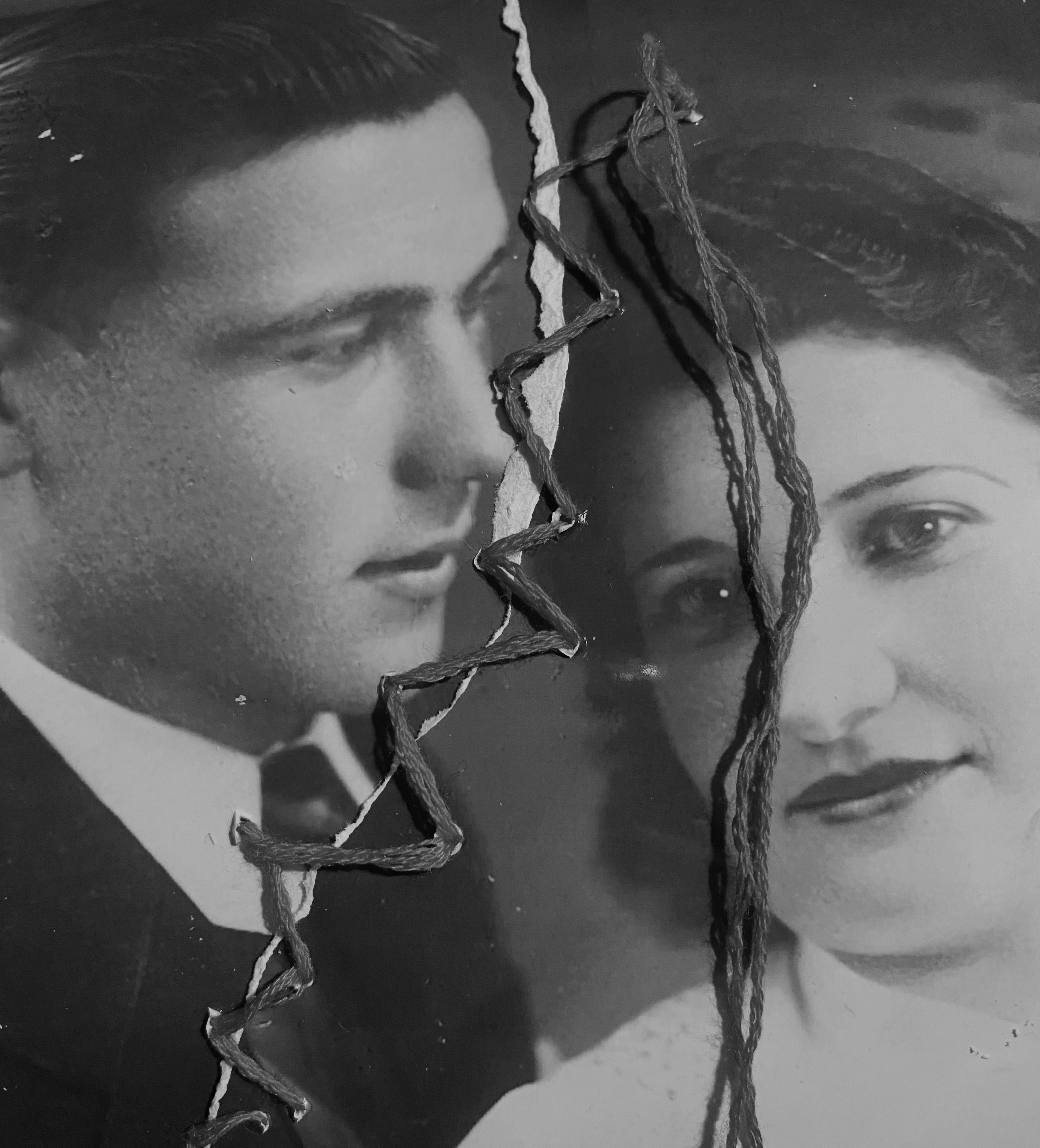 La broderie et les tissus ont permis de modifier ces photographies tout en restant dans l'archétype de l'album photo de famille aux pages abimées, petites annotations... Tout en effaçant les personnes décédées, les couples divorcés et en rendant l'objet sensible.