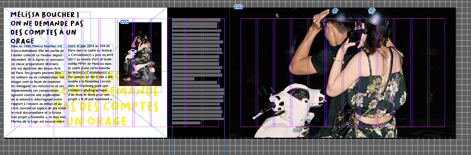 Edition d'un carnet visant à faire la promotion du festival manifesto.C'est un festival de photographie, urbain situé au coeur de la ville de toulouse qui acceuillle des artistes photographes connus ou amateurs à présenter leur oeuvres dans des conteneurs. Couleur bleu et jaune pour mettre en valeur le coté urbain du festival, et la couleur(bleu) des conteneurs, format paysage allongé pour faire le parallèle avec la forme de la structure. Une édition didactique visant à toucher un publique large,simple amateur, famille ou bien photographe aguérit.