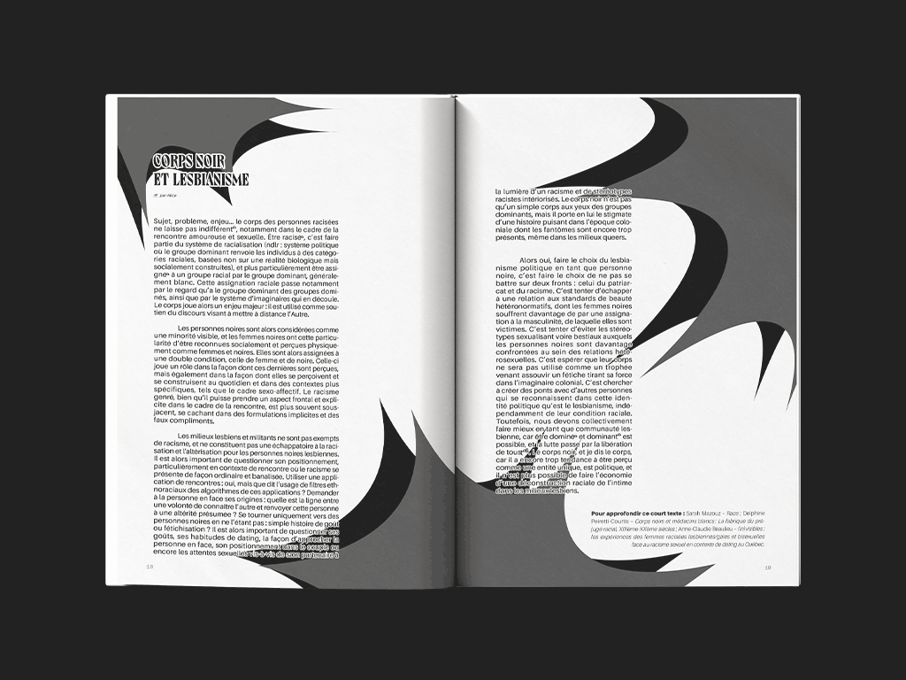 Revue trimestrielle indépendante dont le premier numéro est sorti en octobre 2023. Édition produite collectivement autour d’une thématique commune à chaque numéro, qui publie également des travaux de contributeus extérieus. Le projet s’inscrit dans la continuité des journaux et fanzines lesbiens qui fleurissent dans les années 80, et se veut inclusif et tangible afin de garder une trace des vécus lesbiens.