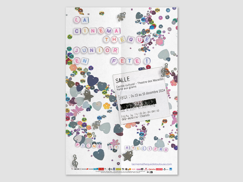 Identité visuelle pour «La Cinémathèque junior en fête !», un week-end de fête du cinéma pour les jeunes et les familles, où ont lieu des projections de films cultes et des ateliers d’initiation autour du cinéma.