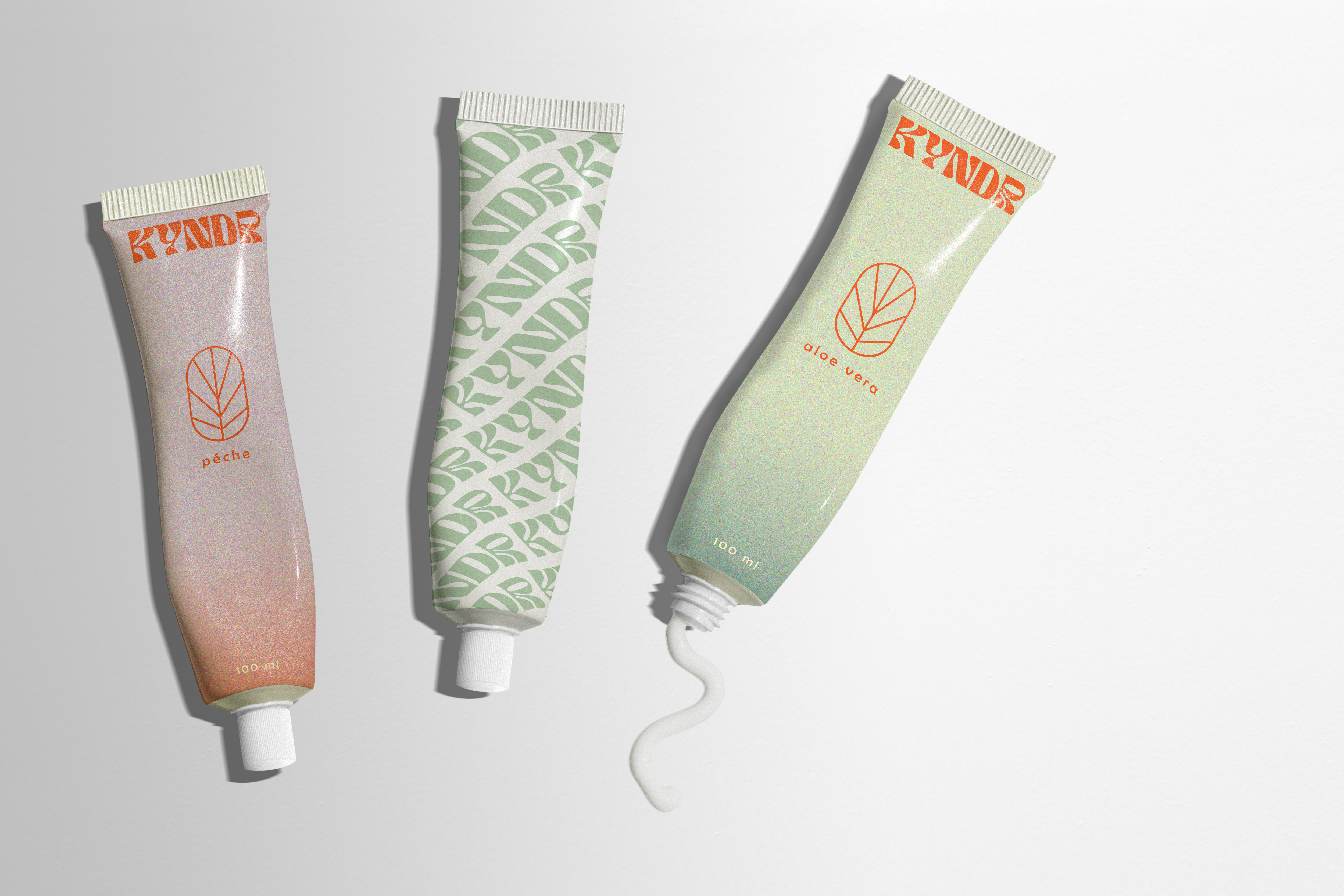 Pour ce projet fictif, j'ai réalisé l'identité visuelle de KYNDR, une marque proposant des déodorants naturels. Identité douce et acidulée, déclinée sur différents packagings.