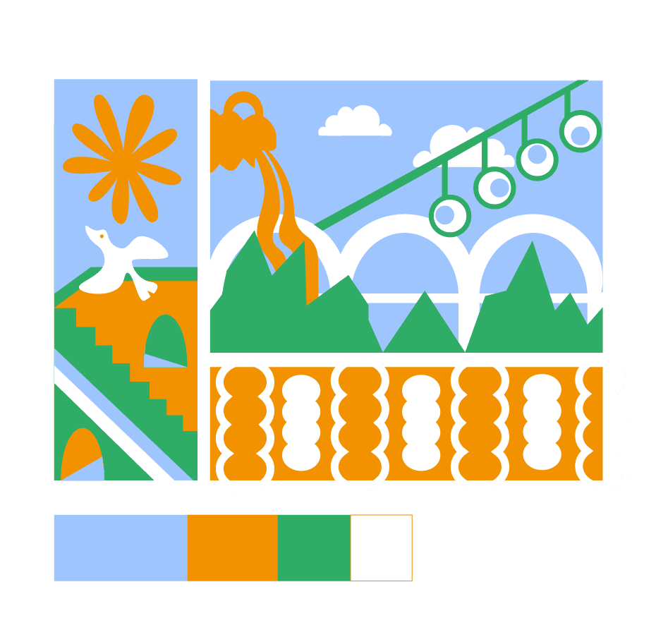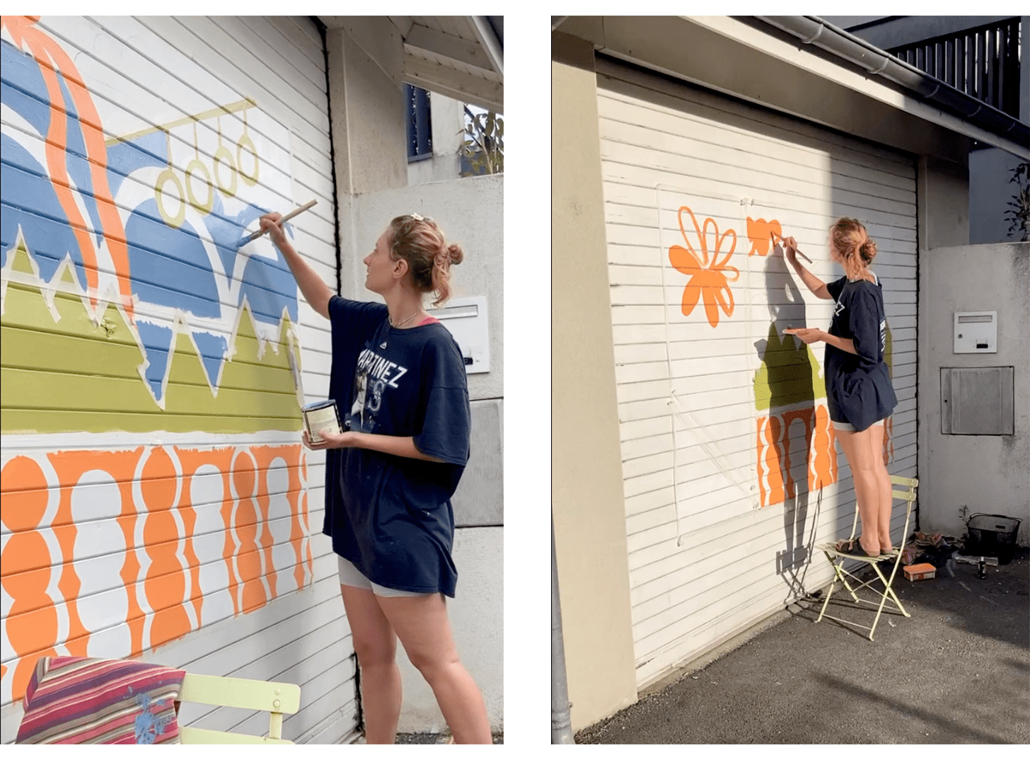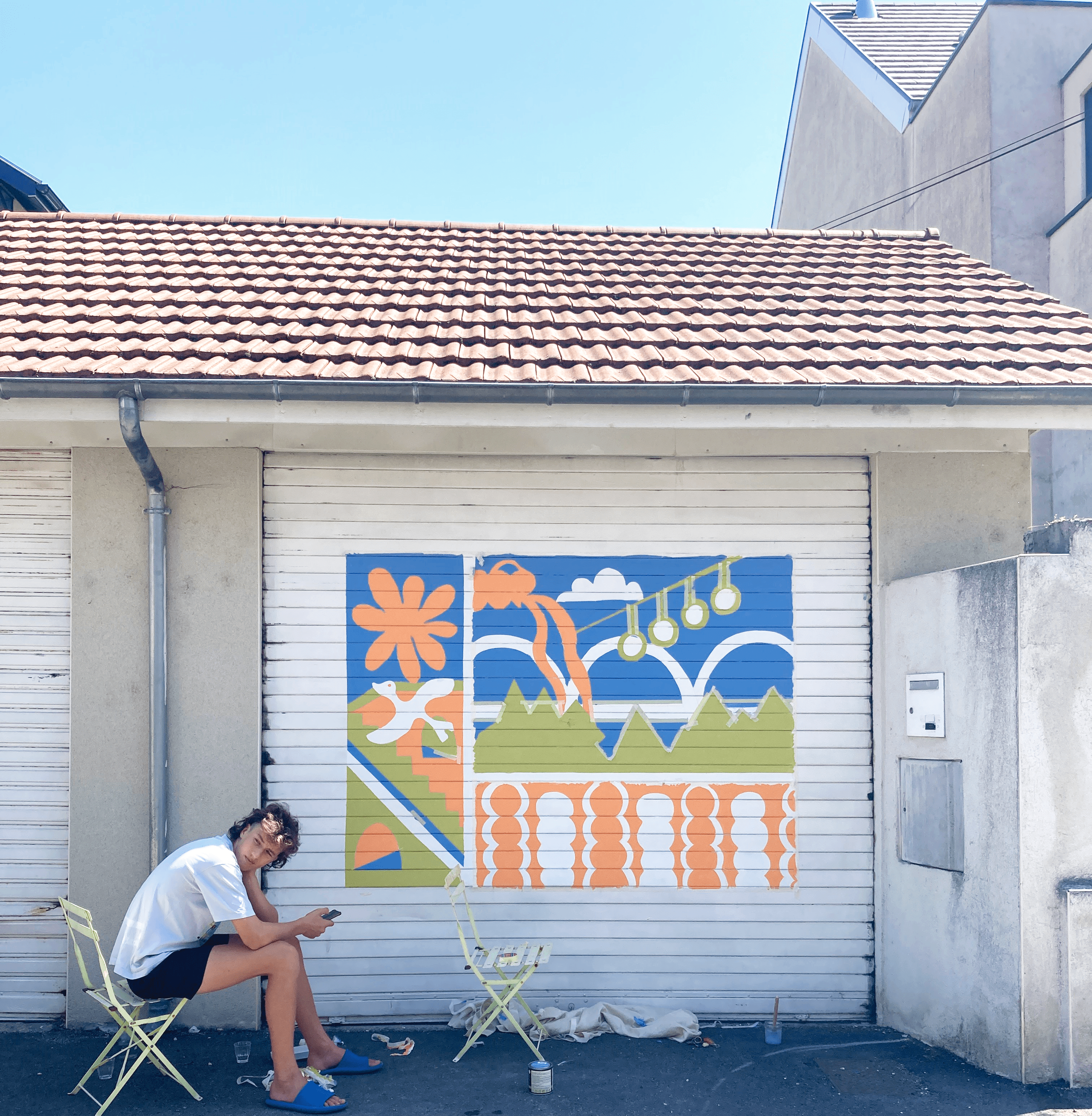 Appropriating and inhabiting space through images to give it more identity. This garage door is a private area, but it opens on a public space, the street. This project was about brightening up and embellishing the street, daring to make it more remarkable. Initially, I worked on my repertoire of shapes and my range of colours using vector software, then on paper, before moving on to painting. The design of this mural is a nod to the city of Grenoble.