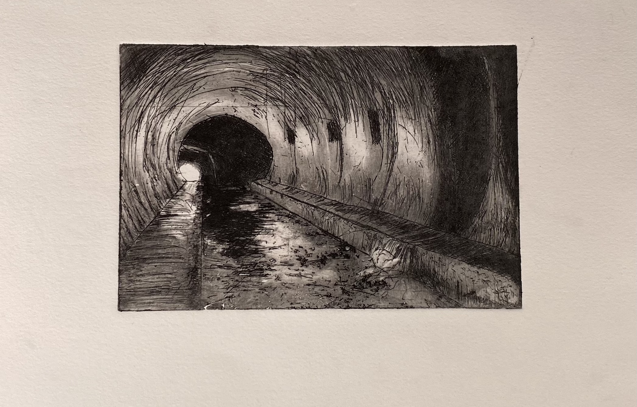 J’ai choisi un visuel de tunnel sombre afin de travailler les notions de clair/obscur, de luminosité et de profondeur. J’ai retravaillé ma plaque pour pouvoir obtenir un effet de l’eau différent de celui des parois.