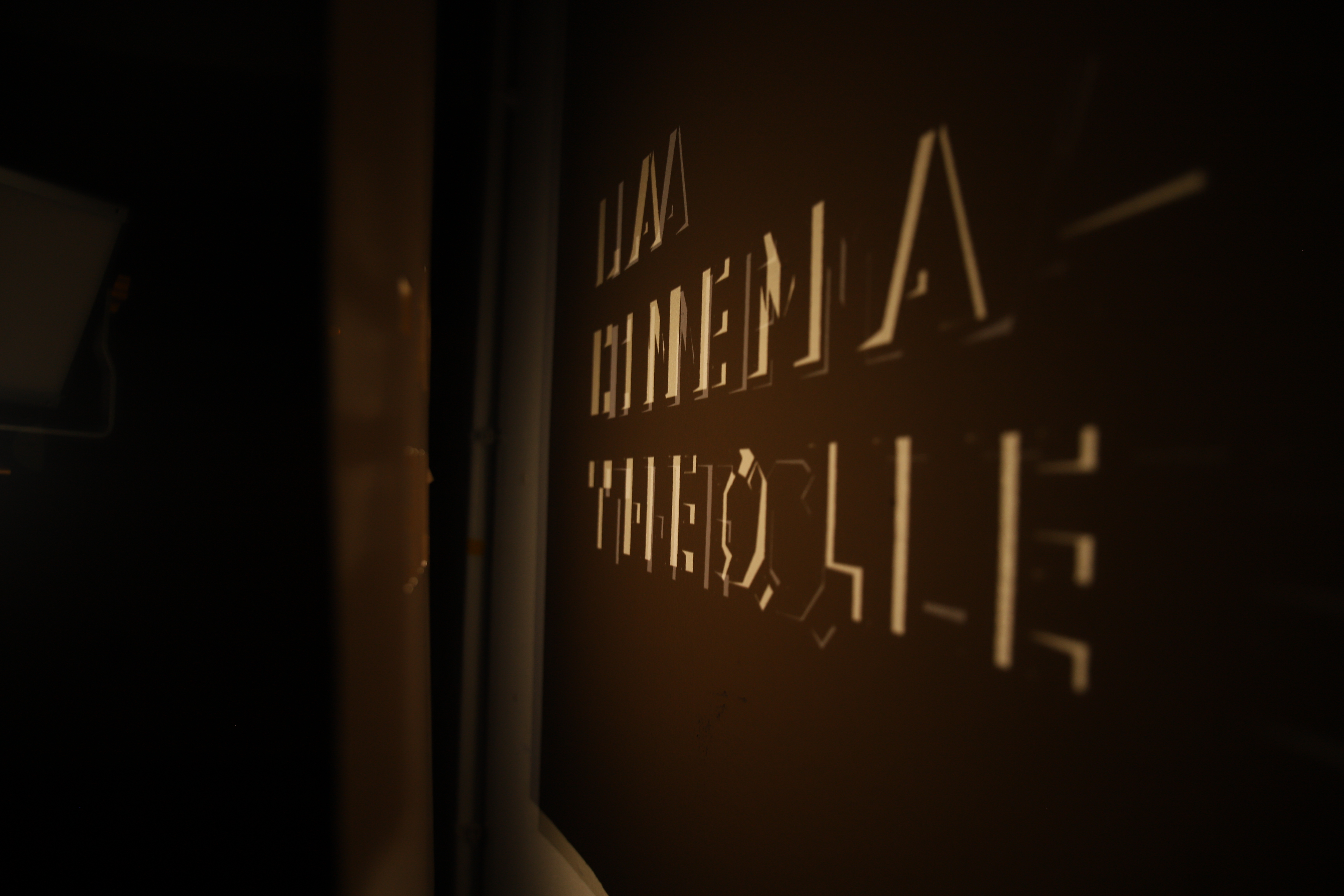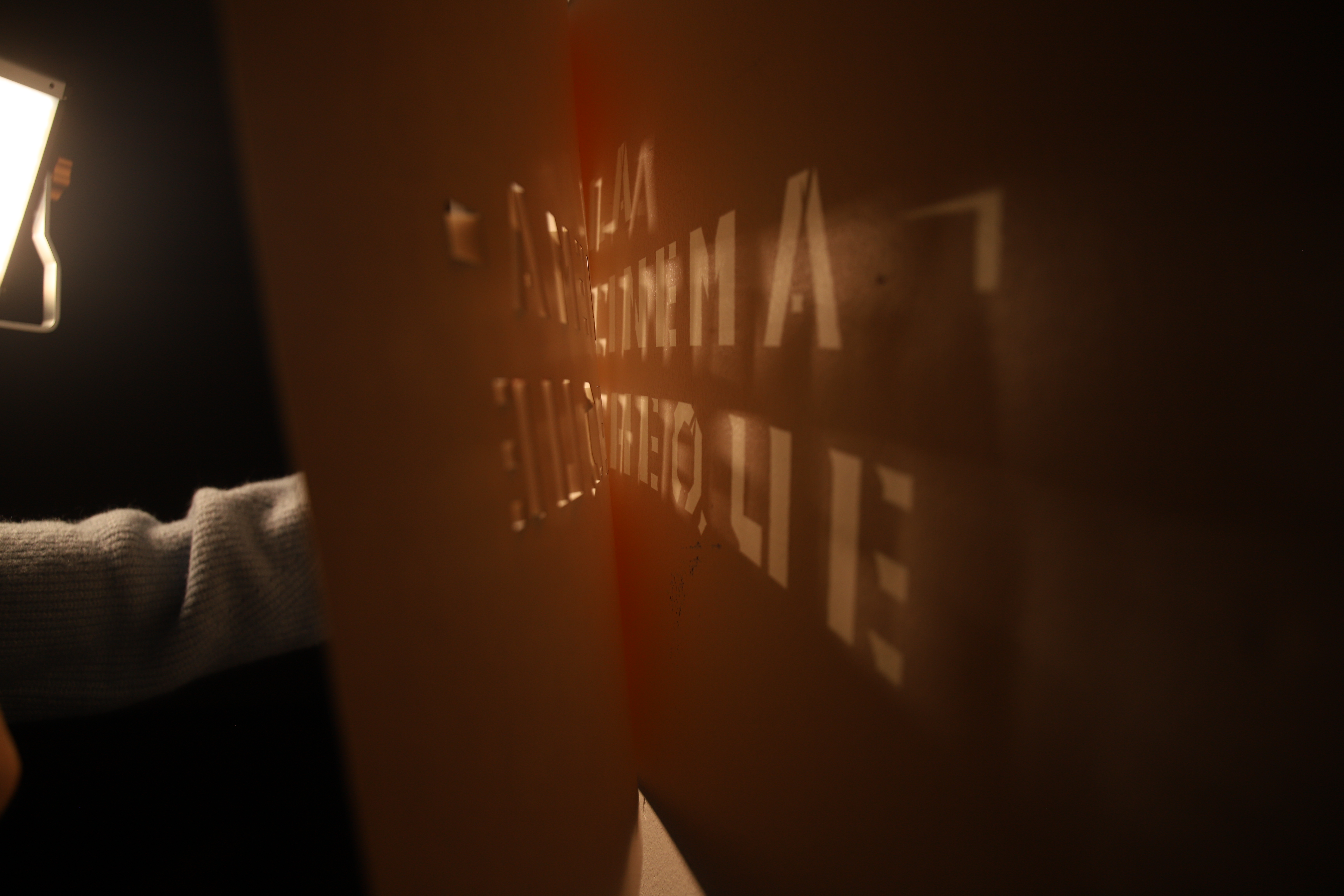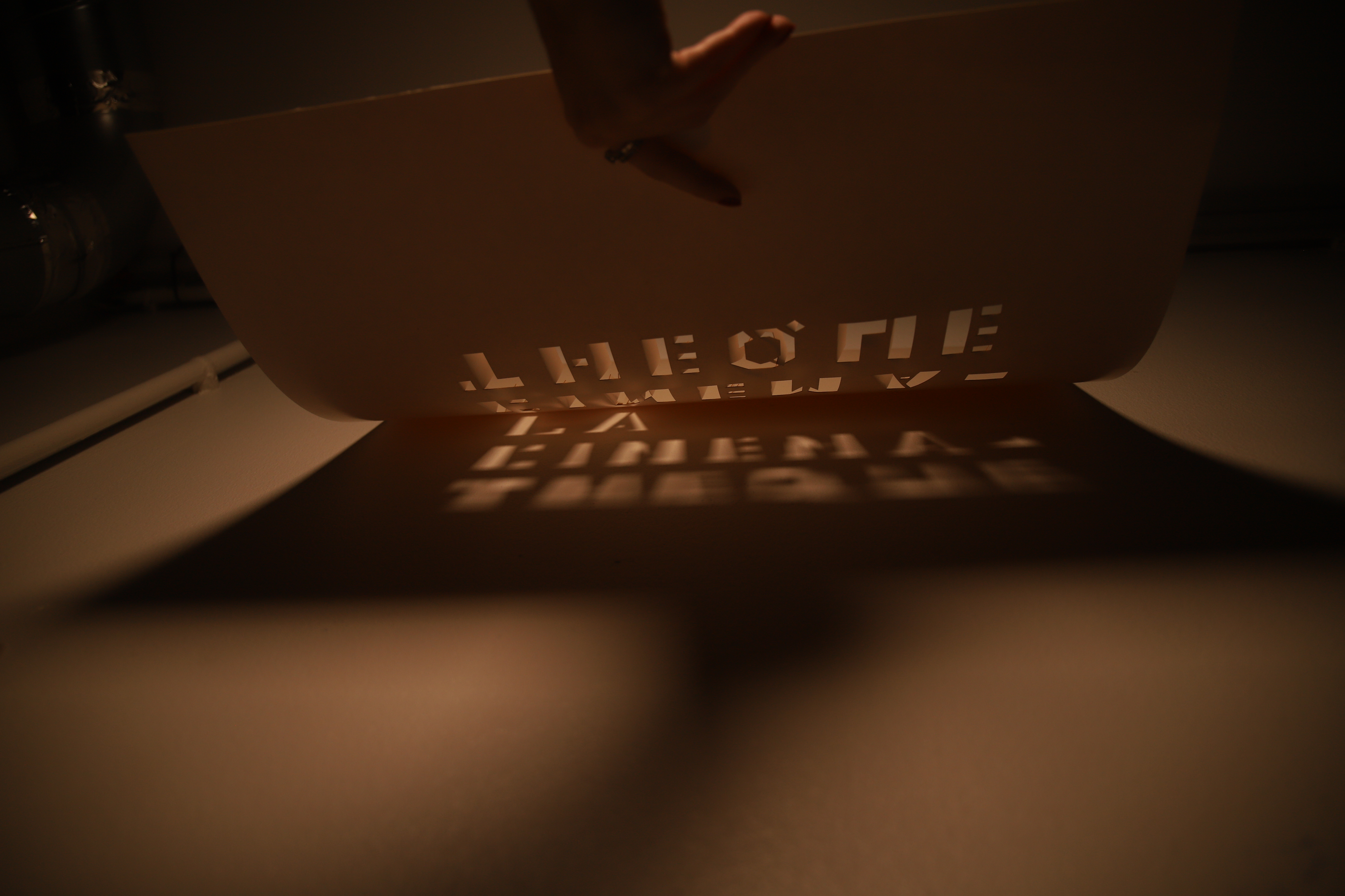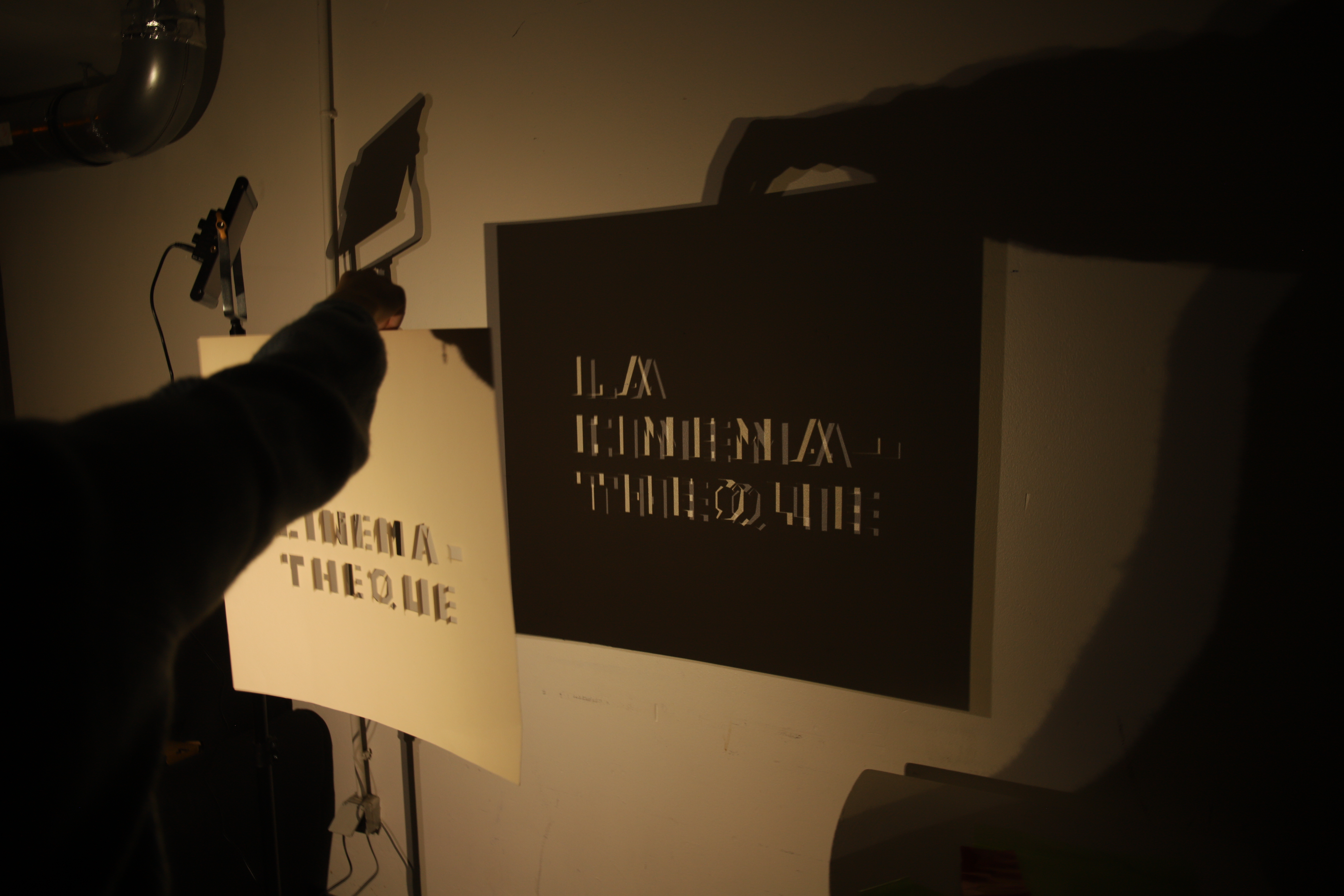 > Volonté de retranscrire la notion de cinéma à travers le jeu d’ombres et de lumières, la notion d’ateliers via le traceur laser et la notion d’enfant par les couleurs.